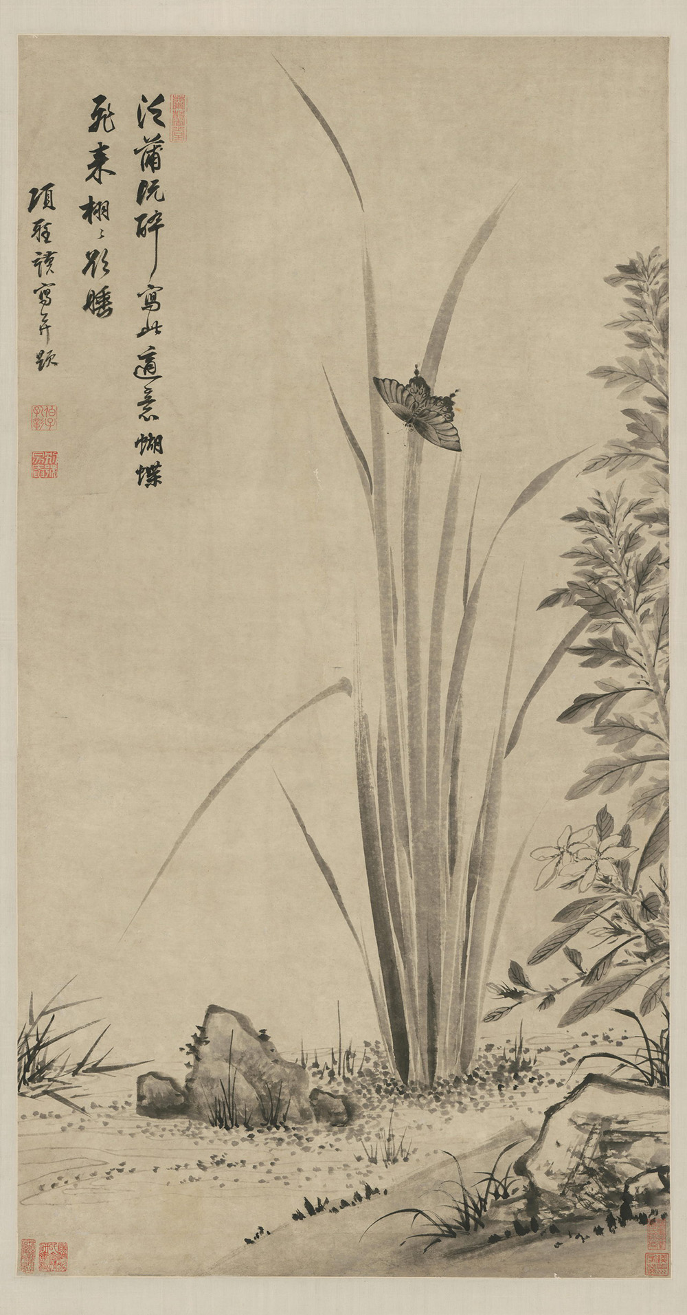 蒲蝶图,画池塘浅水中,一丛菖蒲挺立如剑,蒲叶上停落着一只蝴蝶。造型单纯朴拙,笔墨粗简凝重,构图新颖大胆。菖蒲放在画面中间,用粗笔淡墨挥写,苍健而有变化,很好地表现了其挺拔、厚韧的质感。画蝴蝶使用细笔浓墨,勾染相合,比较工致。菖蒲与蝴蝶,一粗一细,一淡一浓,对比之下别有情趣。其他作为陪衬的花草坡石,亦剪裁大胆,处理得当。