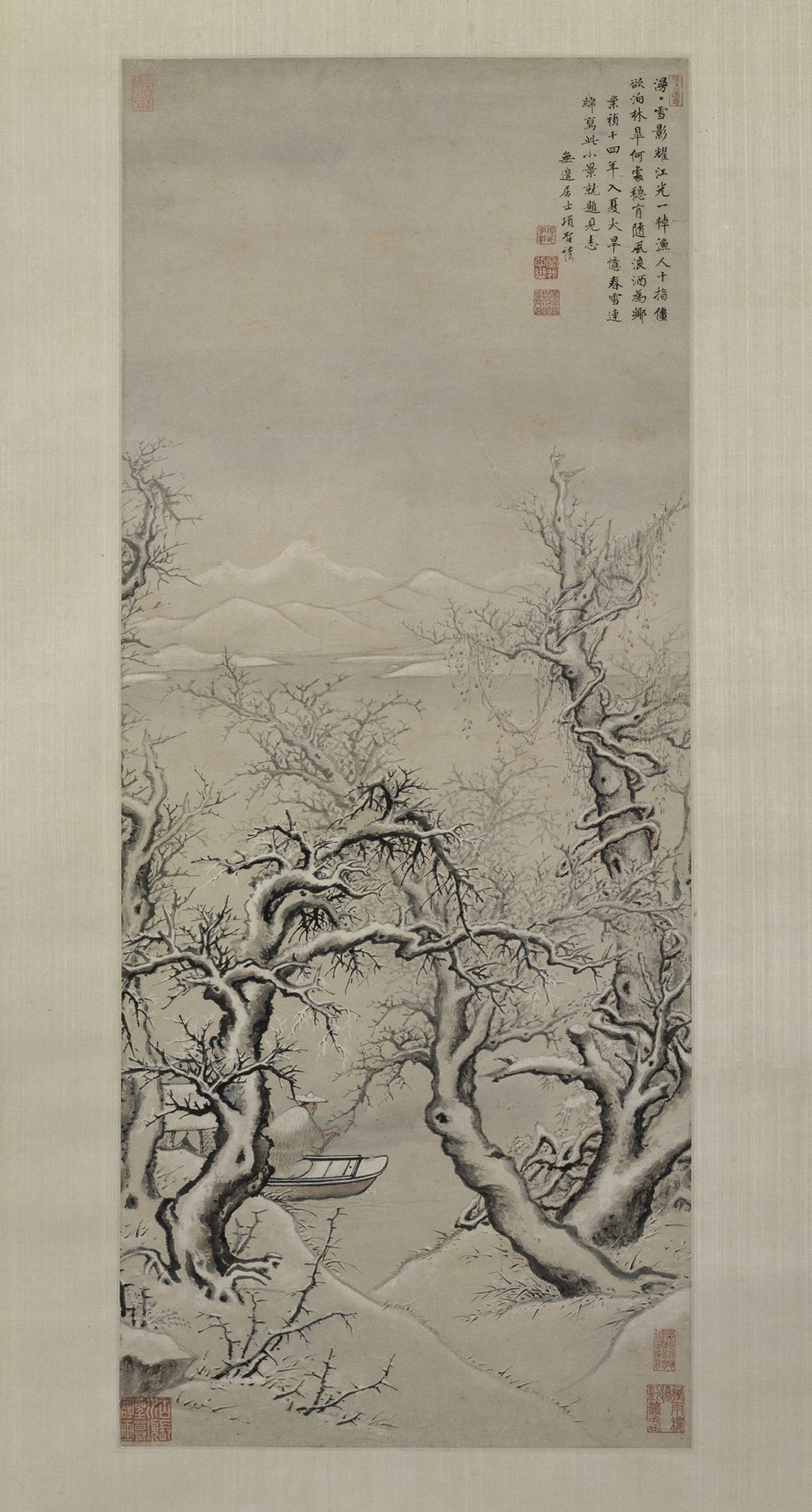 图中皑皑白雪覆盖下的四株老树粗壮挺拔,叉枒错落,树叶落尽,说明时当严冬。树下水边,一渔舟泊岸,渔夫身披簔衣,头戴斗笠,持桨立船头。远处云山一抹,一望无垠。画中自题:“漫漫雪影耀江光,一棹渔人十指僵。欲泊林皋何处稳,宜随风浪酒为乡。崇祯十四年(1641)入夏大旱,忆春雪连绵,写此小景就题见志。无边居士项圣谟。”钤“项氏孔彰”、“写我心曲”等印。项圣谟时年45岁。