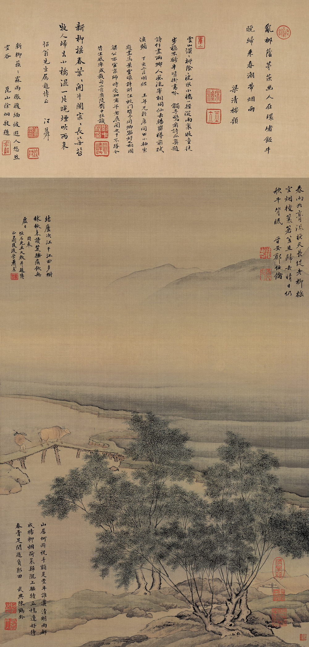 此图描绘的是江南新春傍晚的景色。几棵杨柳垂条,掩映着溪桥田野。远处山峦淹没在层层烟霭之中,显得分外俊秀。放大图片,我们可以清晰地看到小桥上,牧牛人的蓑衣、箬笠、鱼篓、竹竿,及其裤子上的褶皱;一只老牛走在牧牛人前,牛蹄、牛角、迷糊的牛眼,还有它随意甩动的尾巴。这些画面组合,构成了一幅完整的恬淡闲适的田园生活图卷,夕阳归家之意已然跃然纸上。