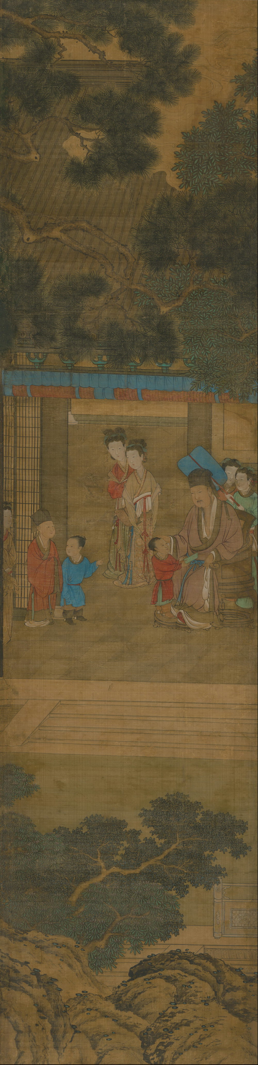 韩琦,北宋仁宗朝宰相,支持政治革新。“昼锦堂”是他在故乡安阳宅中后院所筑,场景宏大,人物众多,皆能安排有序。衣纹清劲,设色雅秀。原图屏为12屏,缺第10屏。
