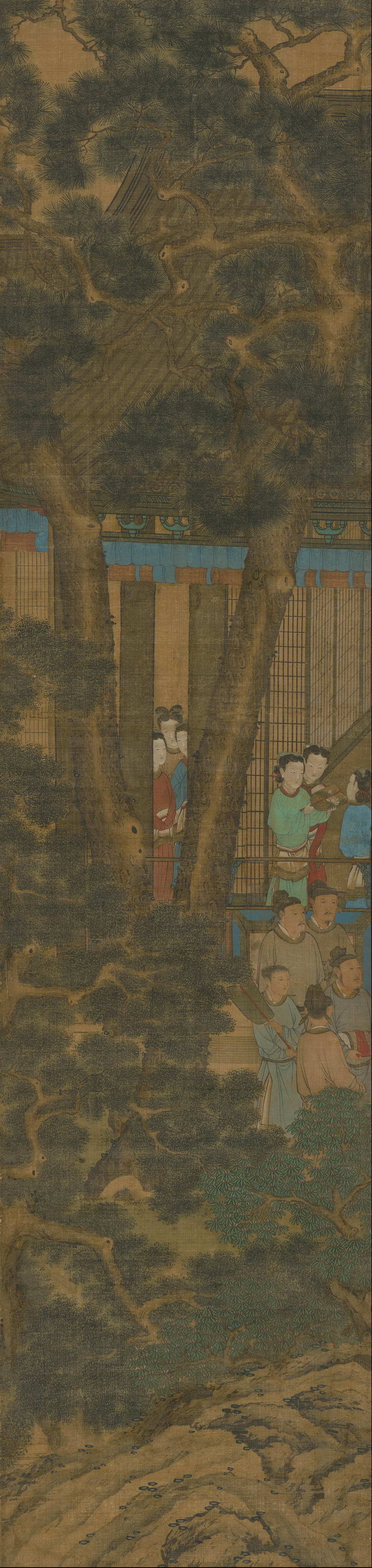 韩琦,北宋仁宗朝宰相,支持政治革新。“昼锦堂”是他在故乡安阳宅中后院所筑,场景宏大,人物众多,皆能安排有序。衣纹清劲,设色雅秀。原图屏为12屏,缺第10屏。