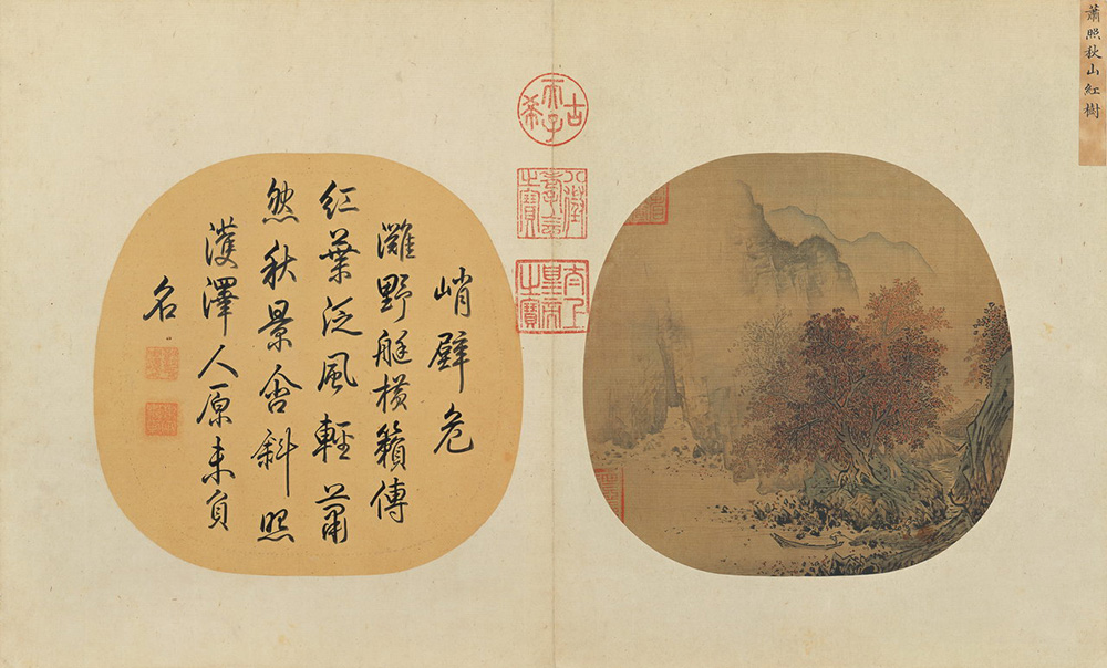 图无名款,画的右上方钤有元内府都省书画之印,明礼部评验书画关防骑缝半印。画心上钤有元「内府都省书画之印」、明「礼部评验书画关防」半印,以及乾隆诸玺,可知其元明清三代一直为宫廷内府处藏。曾著录于《石渠宝笈重编》。是图原为一幅团扇画,以边角式构图作峭壁危滩,江水潺潺,轻舟倚崖,红页烂漫,岸上曲径通向幽静的深山。此画远山渲染,树石运笔似草草而写实,虽师李唐却具己法,意境深远。画风系出自李唐一派,近于萧照。