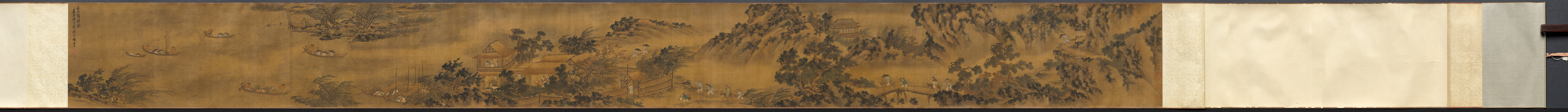 图绘渔村风雨之景,风紧浪急,渔人纷纷结束劳作回家。谢思忠擅作高头大轴,江山雄壮之作,此幅长卷描写细腻,人物众多而刻画生动,可见谢氏画艺之多能。