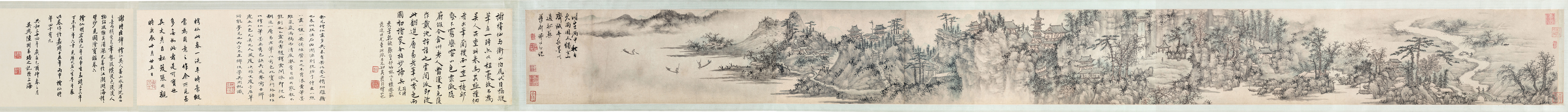 题记:时在丙申秋日,久雨困人,独坐山斋,戏弄水墨,以适孤兴,画卷描绘了虎丘的山景名胜、农耕渔唱,文士悠游等等。