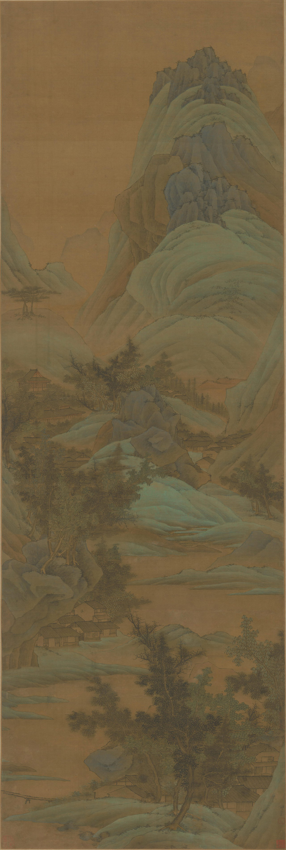 图绘近景溪水岸边房舍错落;远处高山耸立,林木繁茂。构图深远、高远兼备,富有空间层次变化。用笔工整细密,山石树木以石青石绿点染,画风清丽淡雅。此图与传统的青绿山水相比较,更多一分清新明快,是谢荪山水画的代表作。本幅款署:“谢荪。”钤印一,模糊不辨。鉴藏印有:“壬子以后所得”等。