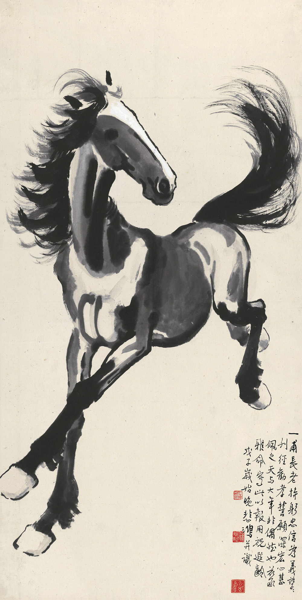 款识:一甫长老持躬忠信为义,孳孳刊经,劝孝。誓愿深宏心甚佩之天与大年非偶然也。兹承雅命写此以报用祝遐龄。戊子(1948年)岁始晚悲鸿并识。钤印 江南布衣,徐悲鸿。作者印:江南布衣,徐悲鸿。马腿的直线细劲有力,犹如钢刀,力透纸背,而腹部、臀部及鬃尾的弧线很有弹性,富于动感。整体上看,画面前大后小,透视感较强,前伸的双腿和马头有很强的冲击力,似乎要冲破画面。