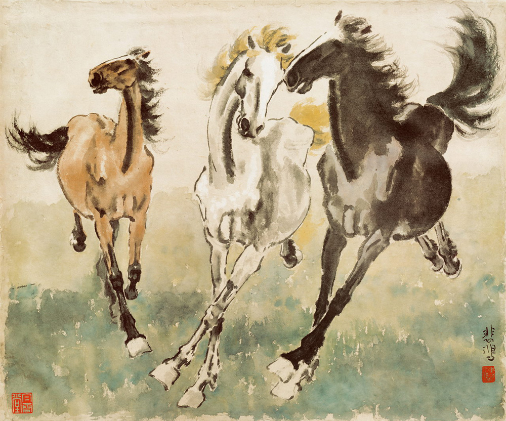 三匹骏马紧绷身躯,昂首扬尾,四蹄腾空,正在驰骋向前飞奔,激烈迅猛之势,头颈鬃毛、马尾乘势飞动。大胆的笔墨使用,晕染控制恰到好处,体现骨骼肌肉的内部准确结构,营造出线条与块面的强烈视觉对比,巧妙的留白处理(马额处使用白色颜料更是独创)显示出类似西方光影效果,真正达到画家所谓的“浑和生动逸雅之神致”。