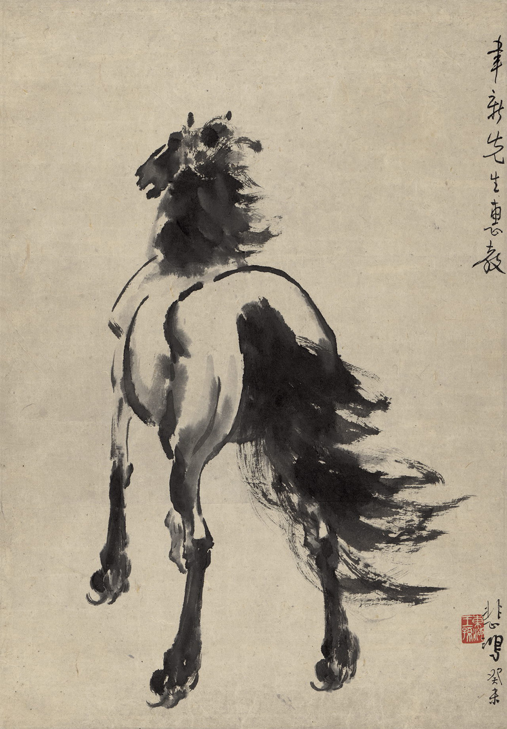 款识:韋新先生惠教,悲鸿癸未1943年。作者印:东海王孙。此图绘一骏马面朝内侧,昂首站立,嘴微张,嘶鸣状。眼看远方。图中马的轮廓以线塑形,线条勾勒得准确、细劲、洒脱,显示出作者深厚的线描功力。马嘴上没有笼头,背上没有鞍鞯,身旁没有牧人或骑手。它们野性未驯,毫无羁绊,诚为徐悲鸿心目中自由之神的象征。