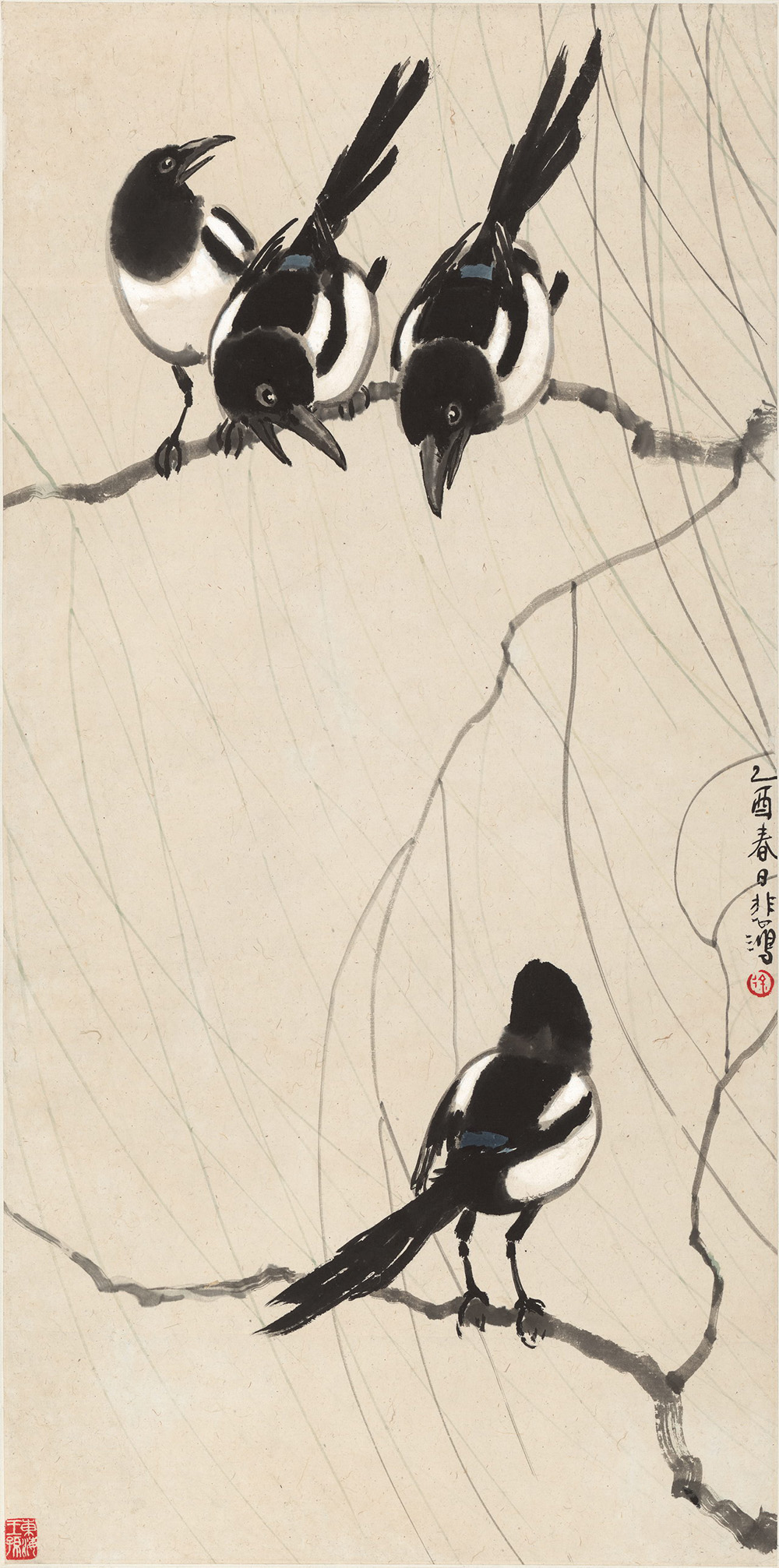 款识:乙酉1945年春日悲鸿。作者印:徐,东海王孙。以浓墨绘喜鹊、淡墨绘柳干、淡花青写枝条,可谓疏朗有致、浓淡相宜;笔墨厚而不板、淡而不薄,充分体现出喜鹊之精气传神、柳条之飘逸妩媚。且设色清雅明快,令观者有如沐春风之感。