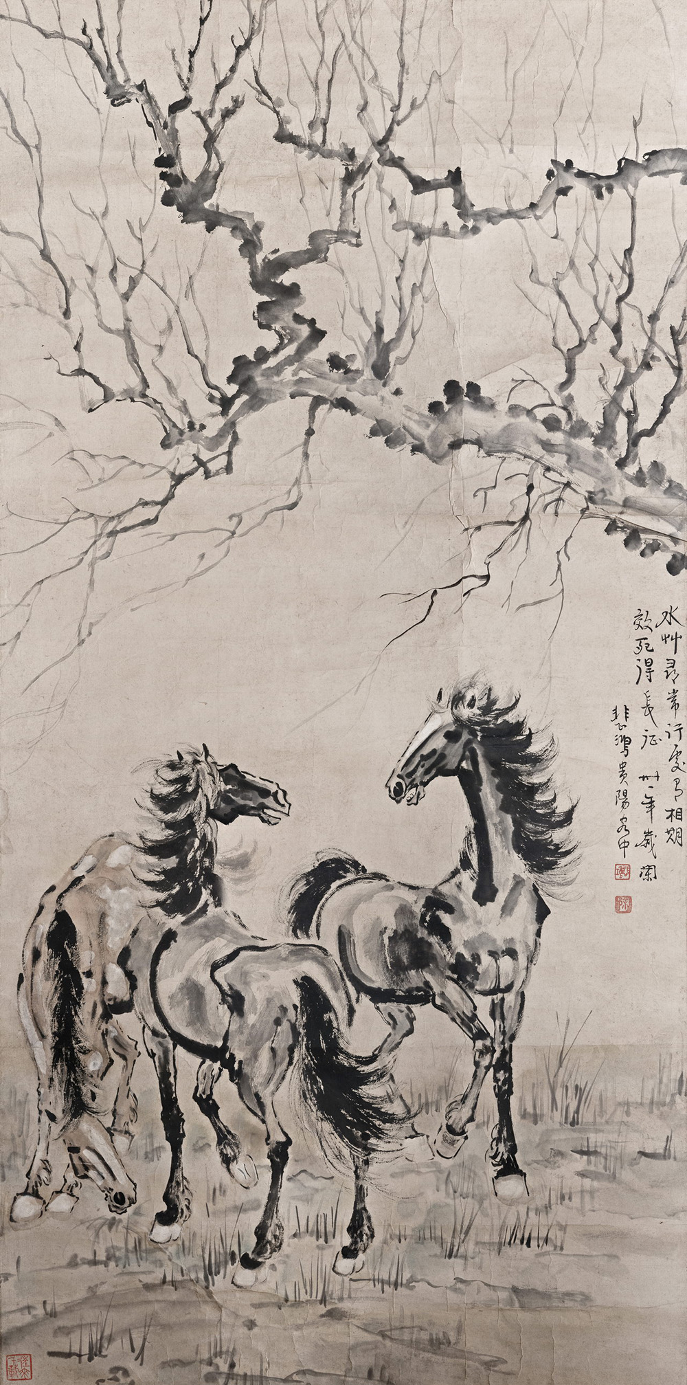 本幅写三马,一改齐驱驰骋之剧动,以三马并立,或正面,或背向;有昂首前望,有低头弯颈呈依偎之姿,亦有提足欲跃者,各逞其态,在相对呈静态的处理手法中亦生微妙的变化,这种细微的刻画描写,足见画家日常观察捕捉马匹动态之用心。悲鸿画马多有稿,据此施加改动变化而出新作,有时甚或以位置相反的形式出之。