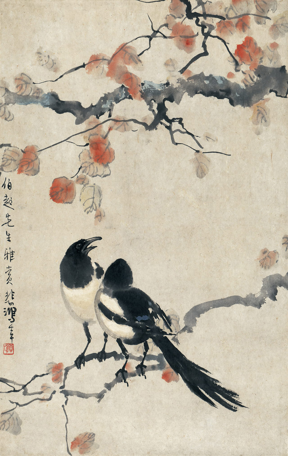 款识:伯超先生雅赏,悲鸿,壬午1942年。作者印:悲鸿。一只喜鹊俯身垂首,似正张嘴言说,另一只则翘首仰望,侧耳倾听。两只喜鹊顾盼相应,使画面布局丰富而统一。画家以湿笔淡墨勾写双鹊轮廓,长喙、身躯用浓墨渲染,表现出圆浑的明暗光感;尾巴根部点染酞青蓝,以示毛色的差异,身体局部施以白粉,增强立体效果。