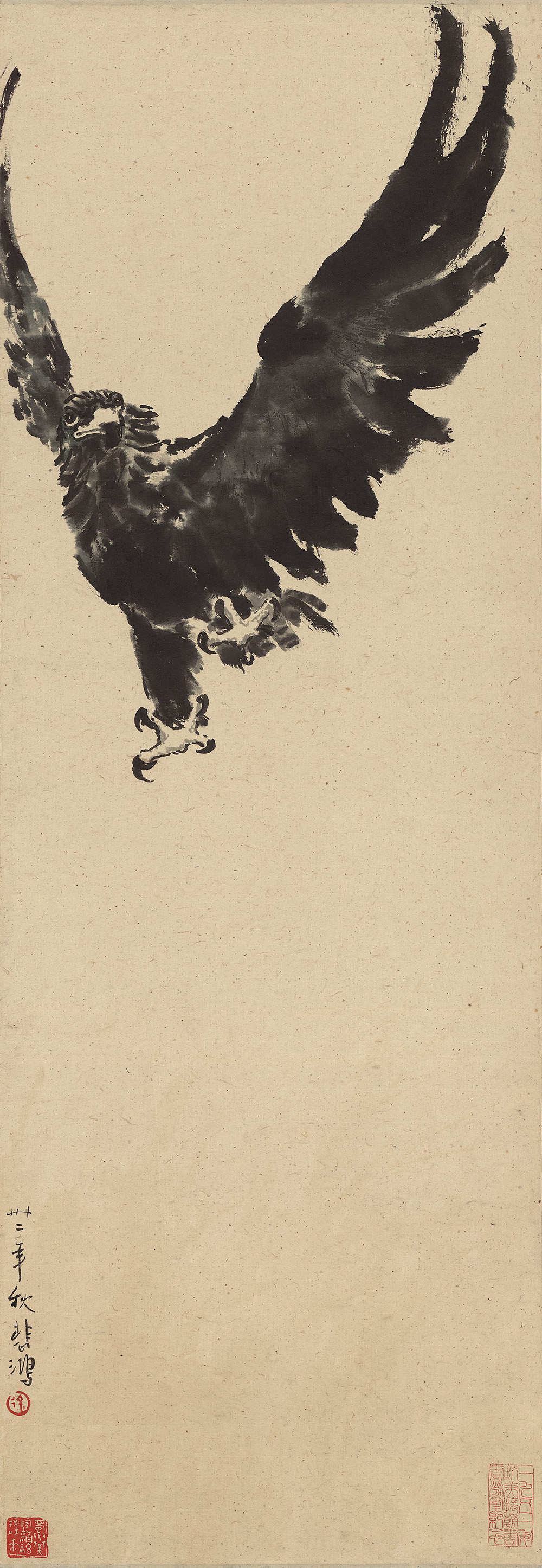 徐悲鸿先生画鹰,以没骨与勾勒相结合。他用有力的墨线及大笔的提顿、皴擦,着意表现突出雄鹰敏锐的眼睛、尖利的双爪及振翅翱翔的雄姿。徐悲鸿生性刚强,喜写猛禽猛兽,而此时鹰在画家徐悲鸿笔下,更是自由翱翔,极目千里的精神寄托。由此可见徐悲鸿先生是中国二十世纪画坛上的一位巨匠。