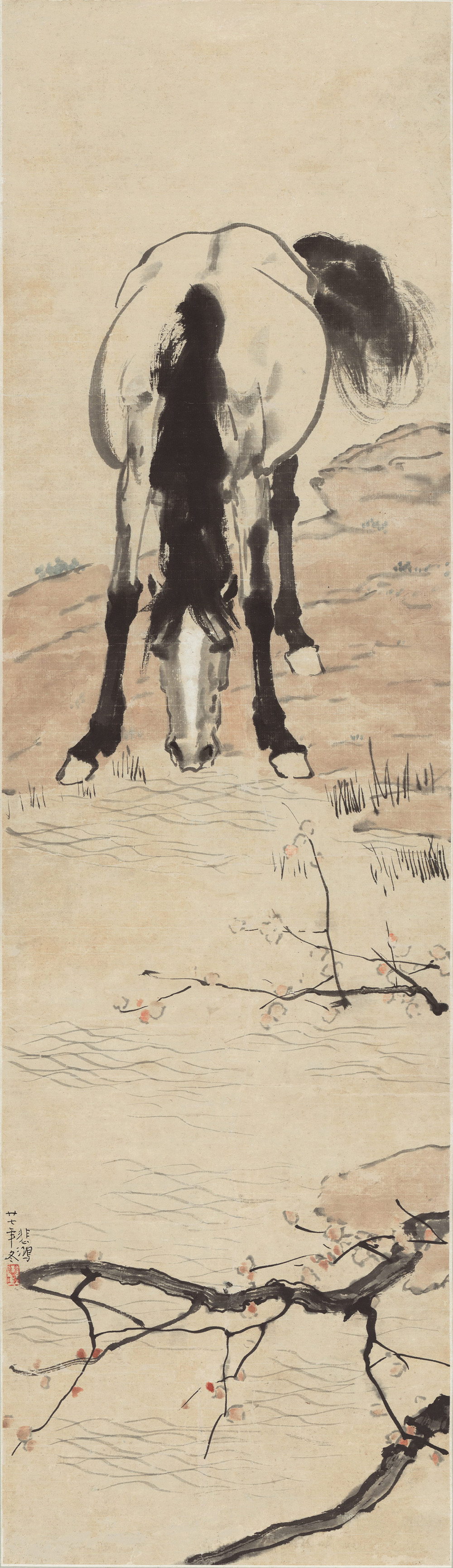 图中骏马俯首在河边饮水。在马匹的具体描写上,徐悲鸿引入了书法用笔来刻画马匹的轮廓,同时以墨色渲染来描写马匹的体积感和质感,真实可信。同时马匹颈部的鬃毛与马尾的飞扬,显示出激情奔放、充满生机的灵动。河中的水碧波荡漾,近水坡岸以寥寥数笔勾勒。