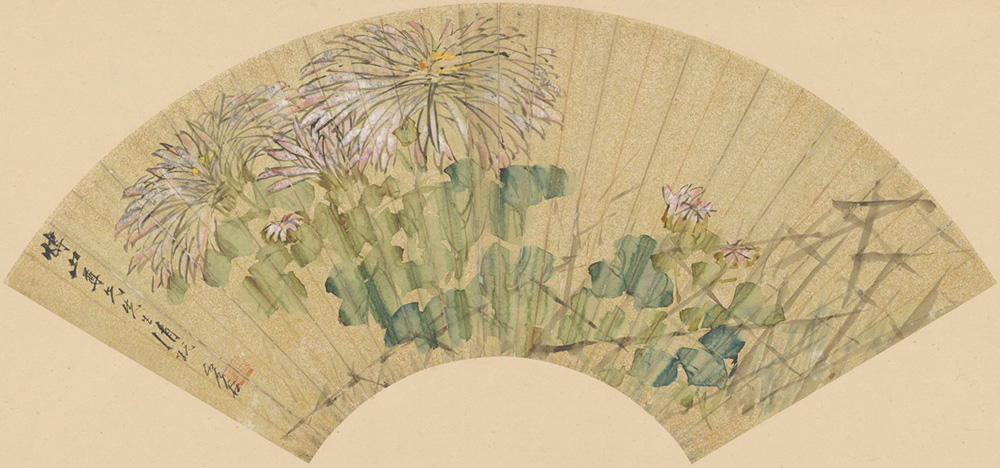 扇页有自题:“博山尊兄先生清玩。虚谷。”钤“虚谷”白文印。图绘数朵秋菊于矮篱前绽放争艳。作者在章法布势上别具匠心,与菊花相佐的不是人们常用的块面状的土丘、山石,而是线条形的篱笆,篱笆的线条断续而有节奏感,增强了画面的灵透性,也使得画作更贴近生活,富有园林情调。图中菊花的花瓣用双勾填彩法,先以笔勾出轮廓线,再以白粉和曙红填色。花儿在线条的束缚下显得含蓄凝重,具冰肌玉骨之美。叶片用没骨法,饱含水分的笔醮草绿、花青直接落纸晕染,水与色充分地交融,有“润含春泽”之味。作者娴熟地运用不同的笔墨表现不同的物象,显现出较全面的绘画技艺。