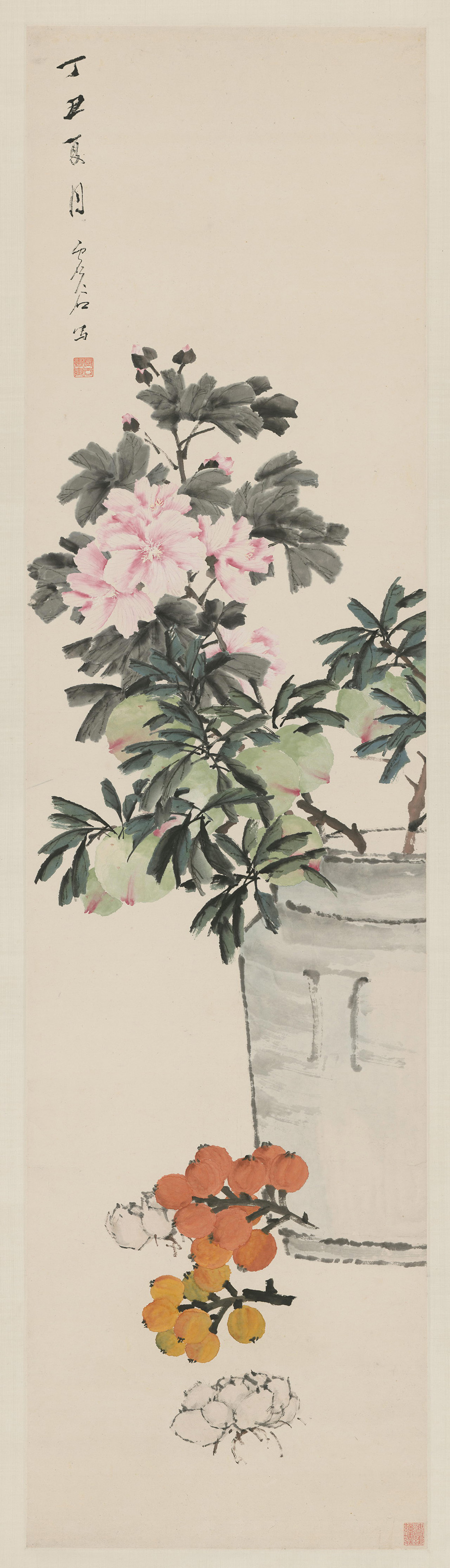 瓶花是虚谷喜画的题材之一。图中蜜桃、枇杷、百合等是日常生活中常见的花果,给人以朴素、亲切的感觉。图中瓷瓶及百合用勾染法描绘,线条简练,造型准确;花卉、蜜桃及枇杷用没骨法表现,层层渲染,增添了花果的层次感及质感。画面设色润泽鲜艳,富有淡雅清新的韵味。