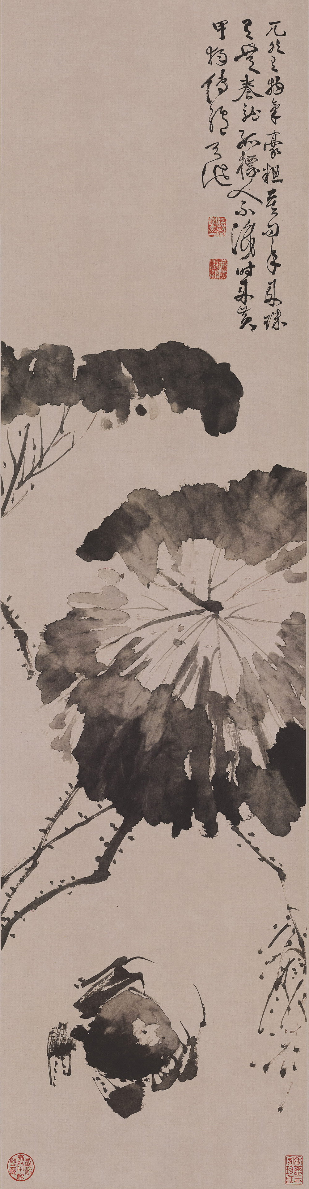 该图绘肥阔的荷叶已开始凋零,一只螃蟹缓缓爬行,留出大片空白表现秋水。构图简洁洗练,布局清新奇巧。