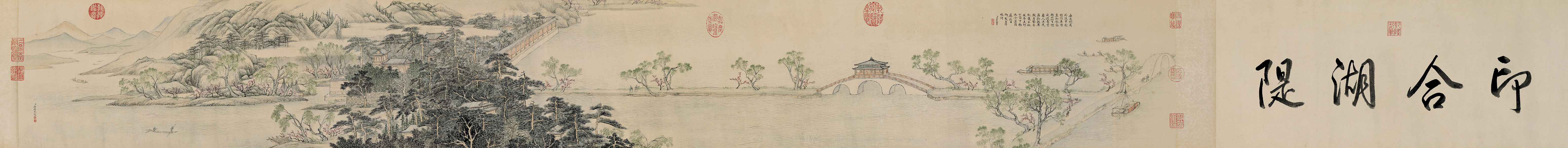 首以玉带桥为开端,长堤卧波,水光潋滟,碧树依依,舟楫往来,游客怡然。堤岸一端长松落碧,浓荫遮日,其间隐隐露出殿宇一角。远处青峰隐约可辨,云气氤氲,幽雅静谧。引首有乾隆帝御题四字“印合湖堤”,钤“乾隆御笔”白文方印。本幅款署“臣徐扬恭写”,钤“臣”朱文方印,“扬”白文方印。本幅还有当时的大臣汪由敦书写的乾隆帝御制玉带桥诗一首,钤“臣由敦”白文方印,“恭书”白文方印。另钤清代内府鉴藏印八方:本幅与前隔水骑缝处钤“石渠宝笈”朱文方印、“石渠定鉴”朱文方印、“宝笈重编”白文方印,本幅上钤“乾隆御览之宝”朱文椭圆印、“嘉庆御览之宝”朱文椭圆印、“乾隆鑑赏”白文圆印,本幅与后隔水骑缝处钤“三希堂精鉴玺”朱文长方印、“宜子孙”白文方印。 画面景物并非对乾隆时期清漪园的如实描绘,而是依据御制玉带桥诗诗意绘制的,诗文云:“垂之则有卧波中,衔绶维鱼幻岂虹。歌咏湖山此生惯,威仪青紫若人工。光通潋滟原规月,势委飘萧不碍风。本是印工留下物,而今还复属苏公。”