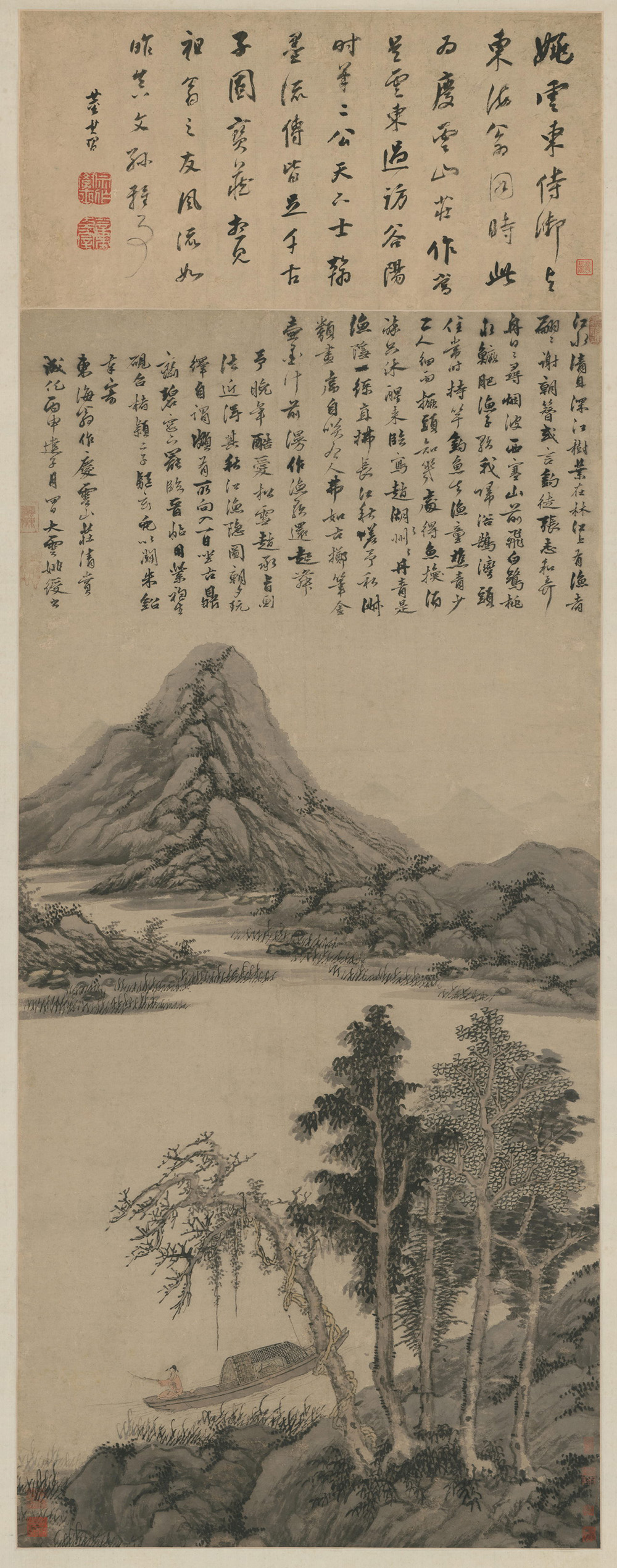 图左上方作者以书法的优厚条件,自题五言古诗一首,末识:“奉寄东海翁,作庆云山庄清赏。成化丙中建子月四日,大云姚绶书。”下铃“云东山馆”、“紫霞碧月翁”印二方。上诗塘明其昌跋:“姚云东侍御与东海翁同时,此为庆云山庄作,当时云东过访谷阳时呈。二公天下土墨流传,皆足千古。子固宝藏,想见祖翁之友风流如昨,真文孙雅事。董其昌”。从题跋可知,此图作于明成化丙申年(1476年),属于姚缓绘画技法较成熟时期的作品。他在题跋中写道:“予晚年酷爱松雪赵承旨画法,近得其《秋江渔隐图》,朝夕玩绎,自谓颇有所向……”此图是受赵孟頫的《秋江渔隐图》的影响而作的,但在表现技法和意趣上,画面中仍有吴镇山水画的痕迹。