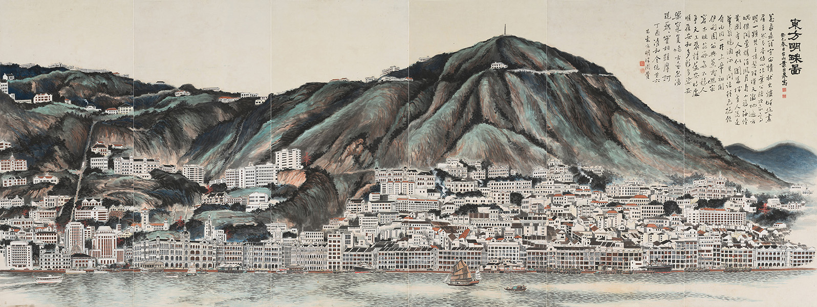 画作较为完整地呈现中环至西环段的维港景色。但画面突出的中心并非今日的金融中心中环,而是上环及西营盘。这是因为在作品诞生的上世纪 50 年代,代表经济命脉的南北行贸易主要坐落于西营盘一带。