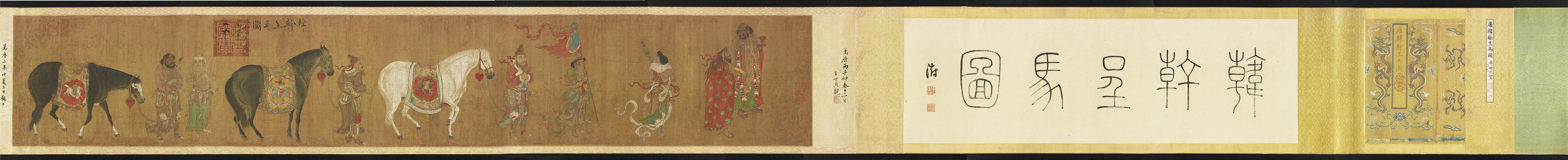 绘八人三马,马匹壮硕矫健,二黑一白,脖上系红缨长坠,马鬃及马尾毛发浓密,马背上皆搭具有民族特图案色的垫毯,马头打扮亦精致。八人身着民族特色衣饰,面部或粗旷,或白净,表情各异。画题《韩干呈马图》