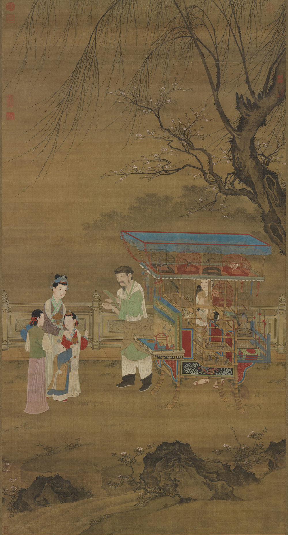 本幅无名款,画春日郊园中,桃花初绽,新柳泛绿,杂草野卉丛生于小溪石畔。柳荫下停放一货担,架上满置鸟笼,笼中鸟色品种殊异,四周并缀有各式童玩。货郎二人,其中一人手执鹦鹉兜售。一妇人携二童立于担前,举手雀跃作欲索取状。人物设色妍雅,服饰细节考究,神情活泼生动,表现出古代社会恬静闲适的生活情态。