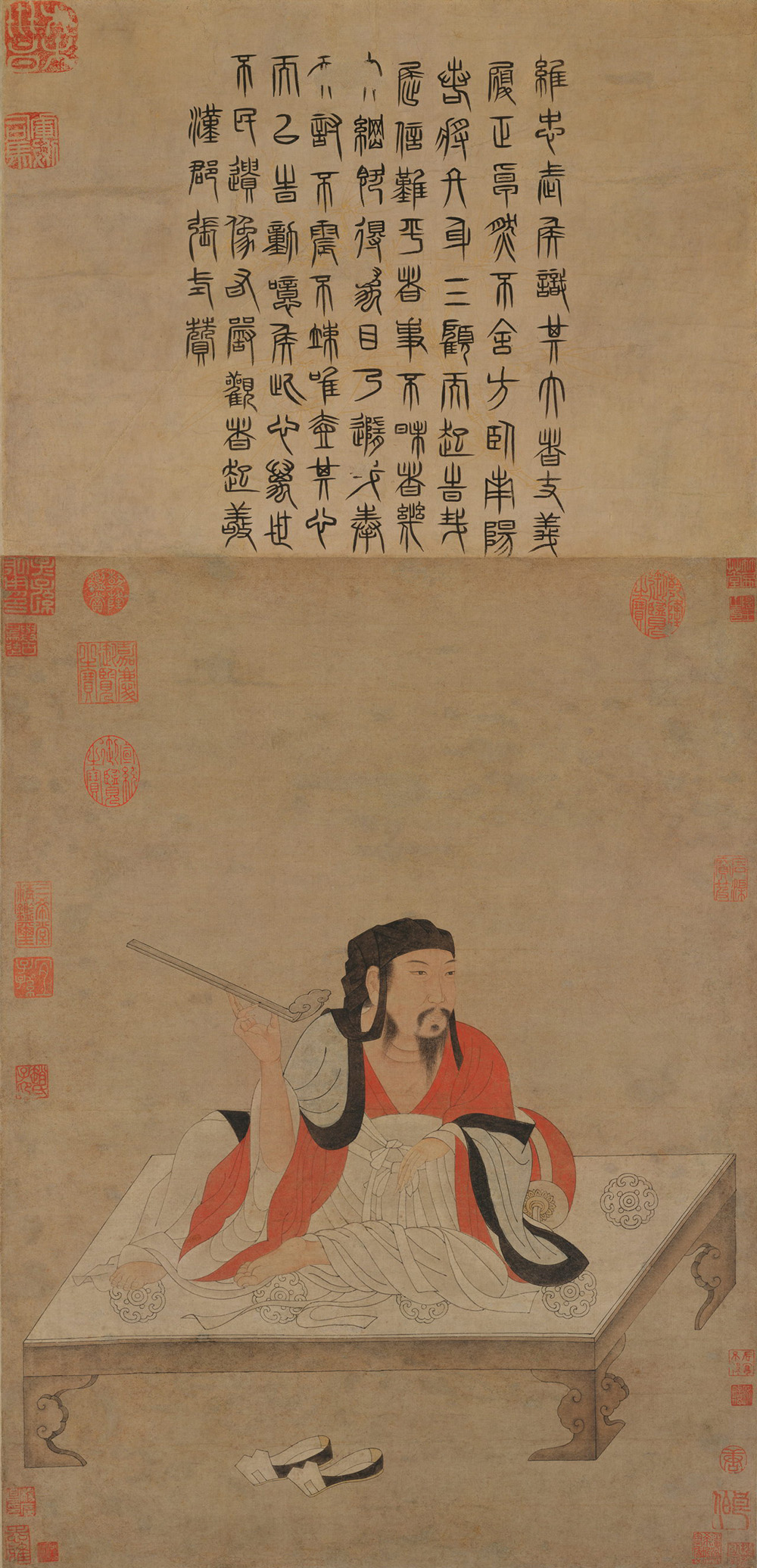 右上角有自书款“大德己亥子昂自写小像”小楷书两行,左上角有“赵氏子昂”朱文印,绘诸葛亮手持如意,凭隐囊而坐。
