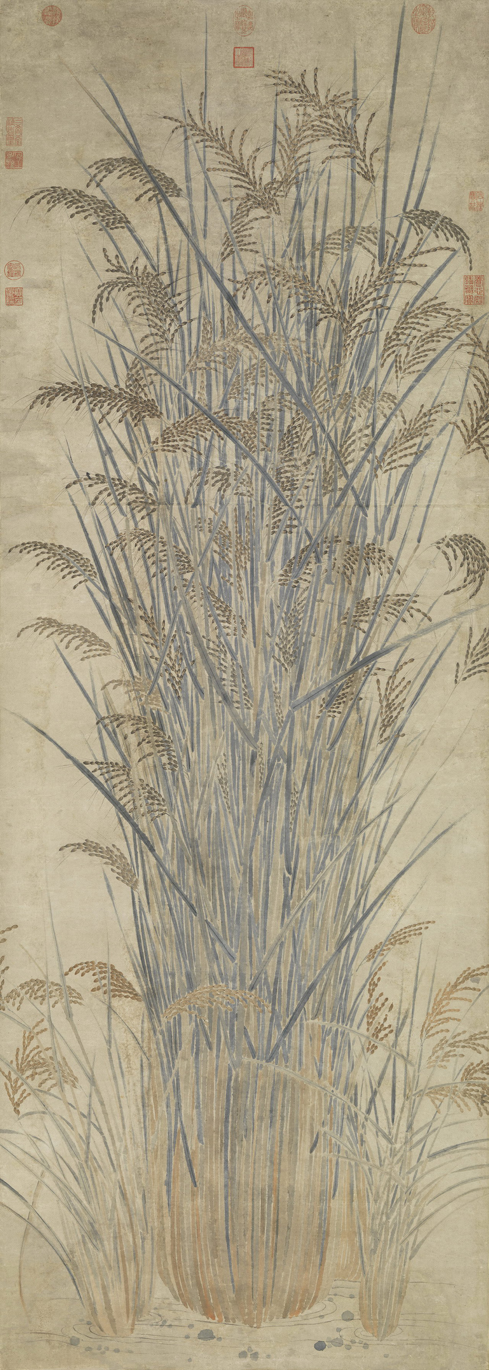 古时以农业为主,稻生双穗,或稻产丰收,是一种祥瑞,也称之为嘉禾。画中这一丛稻长得比一般的稻子高大,茎叶茂盛,稻穗饱满沉重,显现出丰收的预兆。在用笔上,除稻穗外,都用花青和赭石以没骨法染画而成。嘉禾顶立在画幅中央,构图非常单纯,主题强烈,有着简朴而新顷之感。