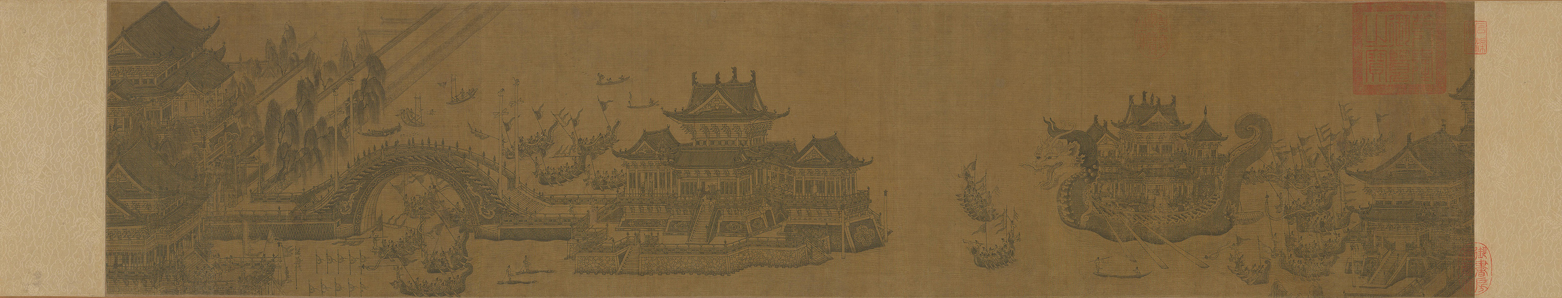 墨线白描界画楼阁反映了元代建筑绘画最为典型的时代新风,宫廷画家王振鹏则是这种风格的代表人物。他曾先后两次画过《金明池龙舟竞渡图》卷,描绘的是北宋崇宁年间(1102-1106年),每年皇室在宫廷后苑金明池举办龙舟竞渡的盛大场面。由于王振鹏颇负盛誉并受到当时贵戚大长公主的赞赏,引得后人纷纷临摹,至今传世的摹本和改绘本仍有七、八本之多。此卷笔法秀劲细密,纯用白描、舍弃设色的表现手法更使画面千繁万复而不显阻滞拥塞,给人细腻、明洁、素雅之感。殿阁巍峨,龙舟争渡,旌旗猎猎,橹桨奋动,动态的舟船和众多的人物活动打破了静态楼阁的沉寂,赋予了通常流于平板的建筑画紧张的情节和热烈的气氛,反映出王振鹏建筑画的风格特点。正如虞集所评:“振鹏之学,妙在界画,方圆平直,曲尽其体,而神气飞动,不为法拘。”本幅无作者款识,有清乾隆、嘉庆内府收藏印记4方。