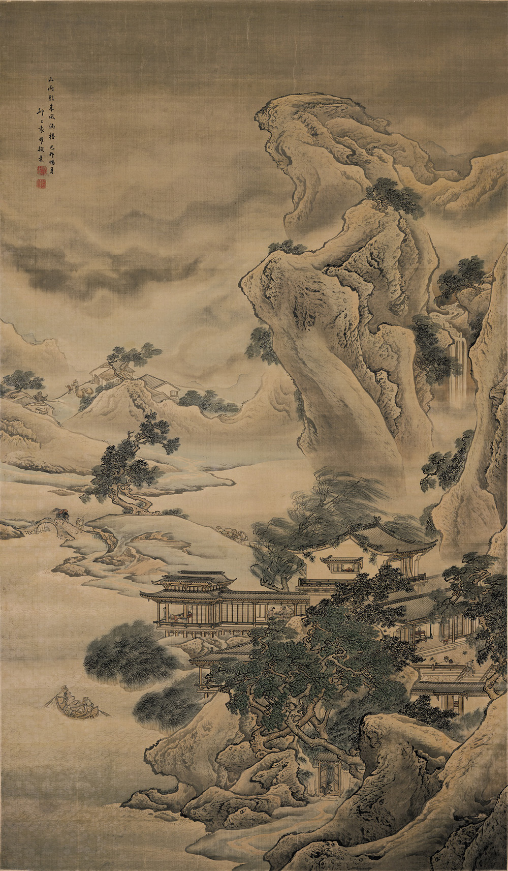 此图是袁耀中年时期创作的大幅画作。绘高山峻岭,山石陡峭,树木葱郁,楼阁华丽壮观,境界幽美。用笔严谨精到,山水以工笔画出,墨色富于浓淡变化,明净雅致,意境恬淡,别有一番韵致。