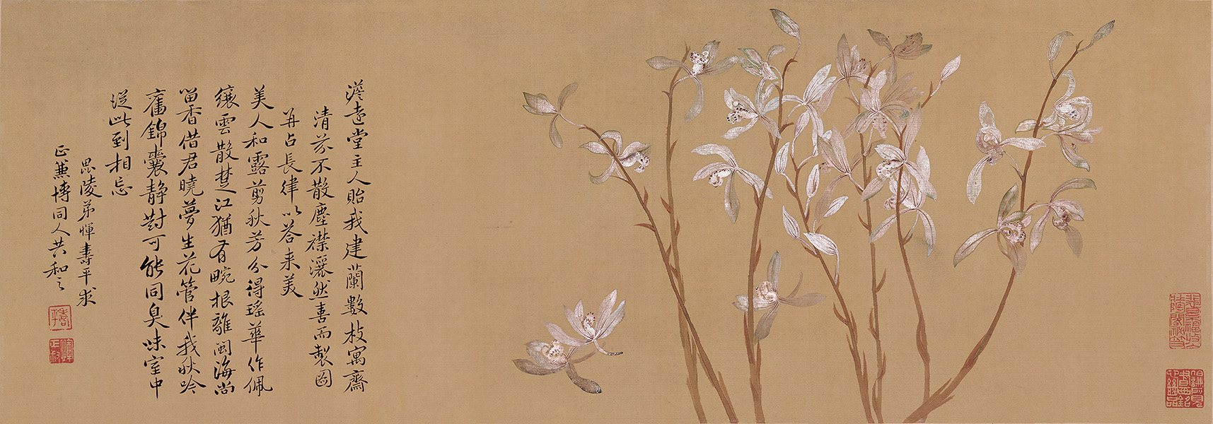 这幅画又名《建兰图》。建兰,亦称秋兰。描绘数枝兰花,雅致美观,色彩典深沉,布局精致工整,笔法细腻独到。图绘兰花数枝,苍秀挺拔,布满画面,构图简洁,画法新颖别致。