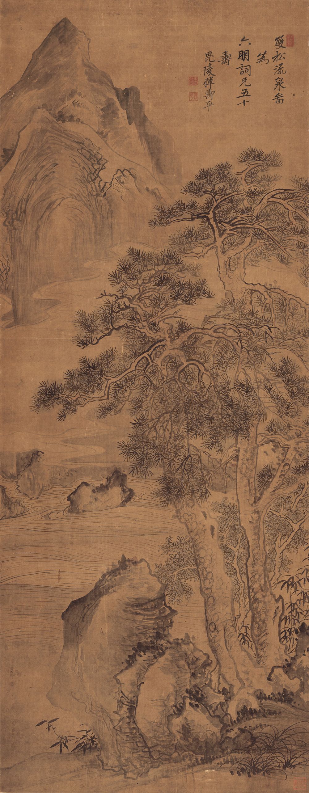 图中山峰巍峨高耸,瀑布从山崖之间逶迤婉转而出,因矶石抵柱而迥旋激荡,如同泉流。近景堤岸沙坡之上灵石伫立,临水的山角处双松针茂如冠。