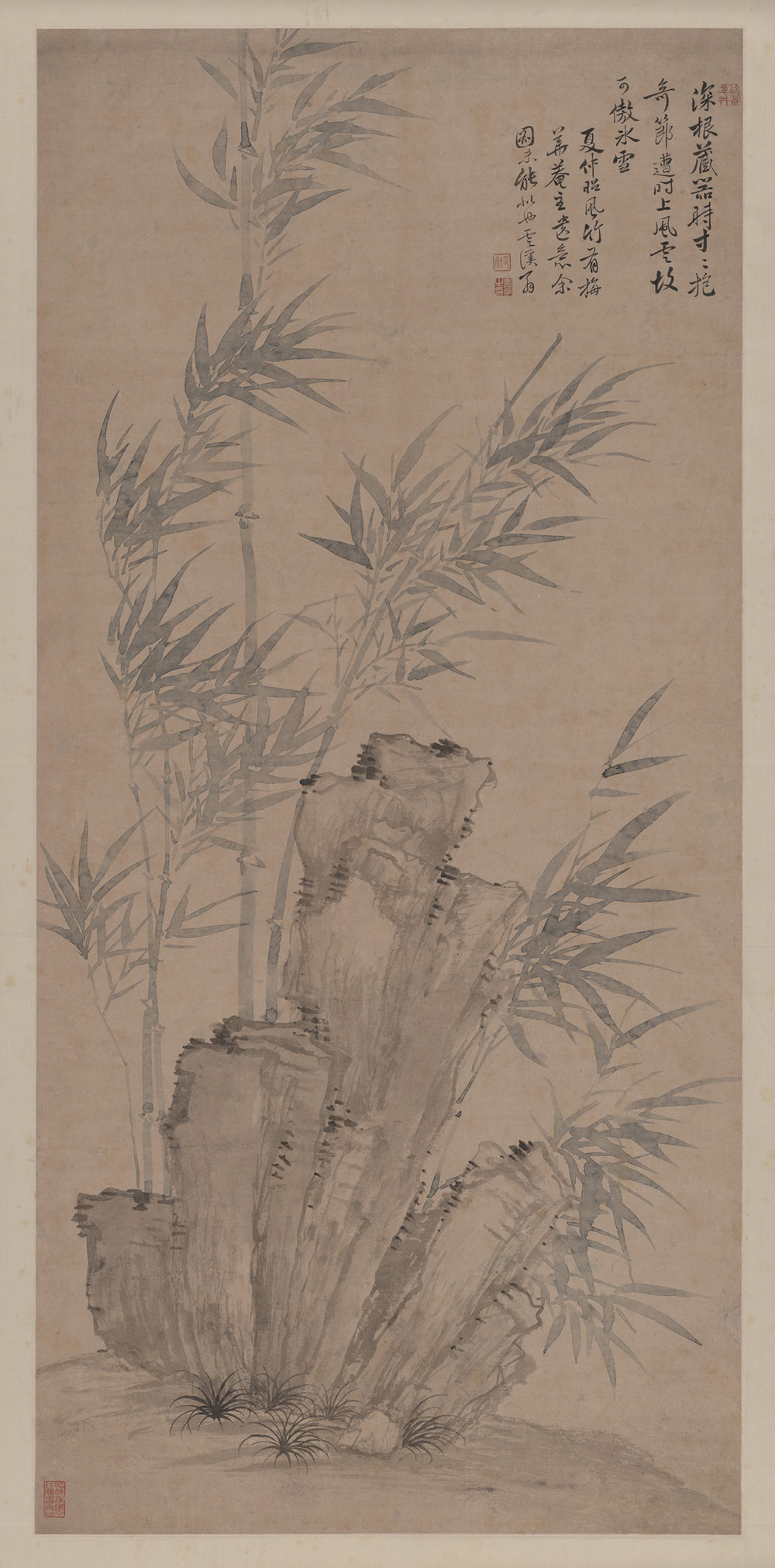 图绘湖石一块,呈山字型耸立,边缘以浓墨点缀,棱角坚锐;后侧的一丛竹子杆直修长,以没骨法淡墨绘竹叶微微右倾,似敷上一层薄薄的寒霜;地面杂草数丛,霜后渐以枯败。虽为深秋初冬之时,但画面错落有致,清新自然。