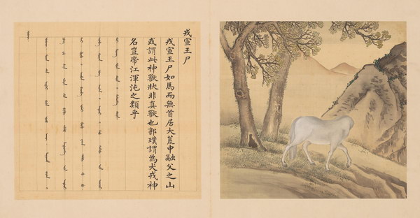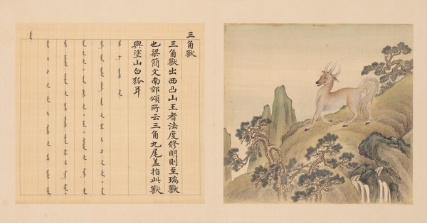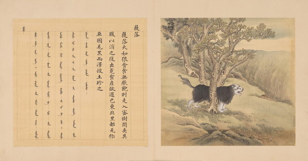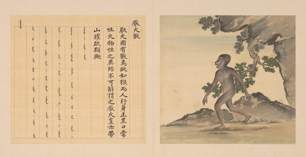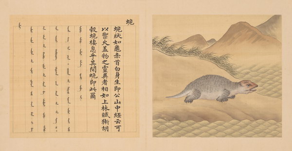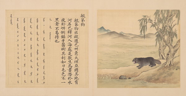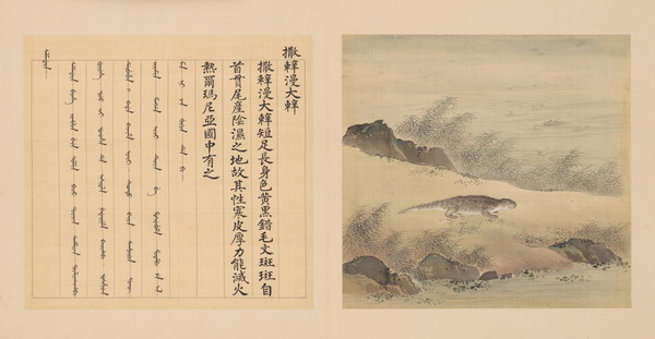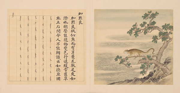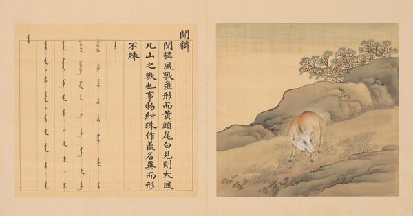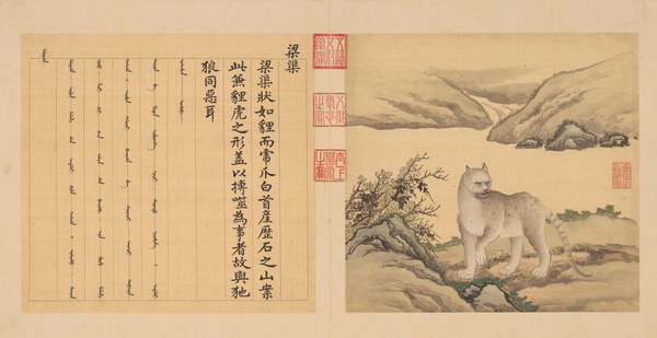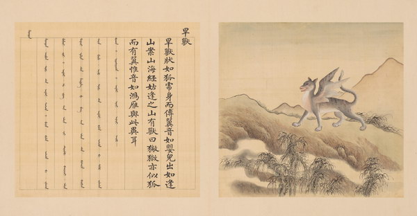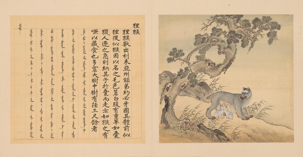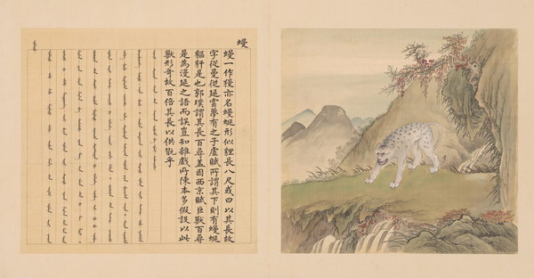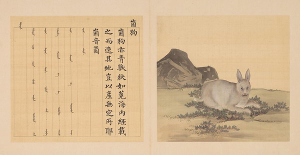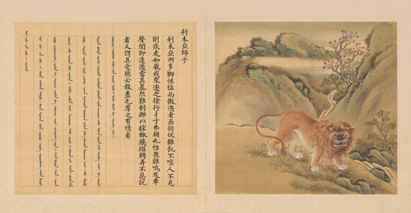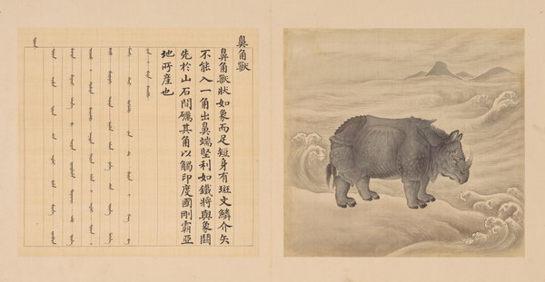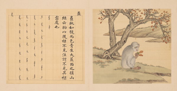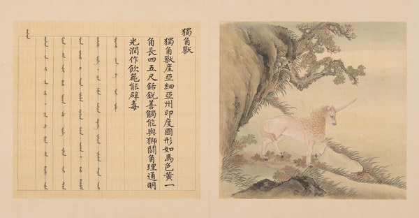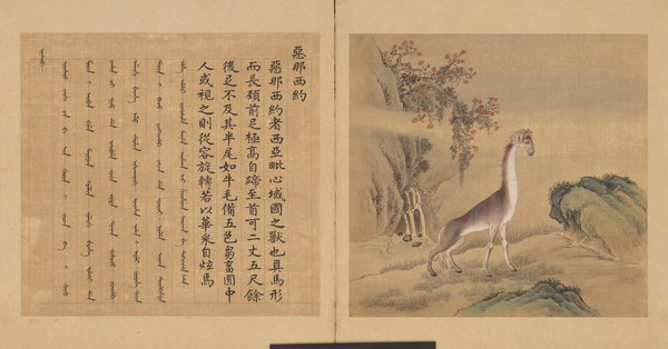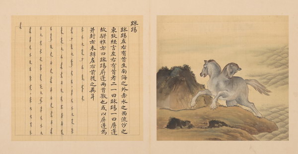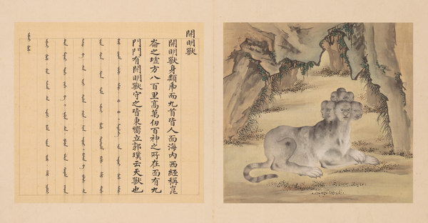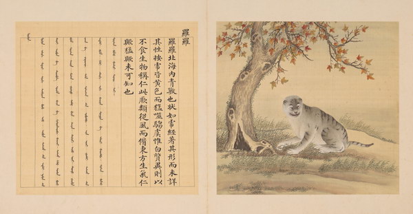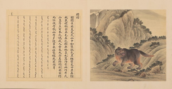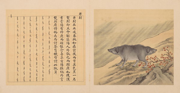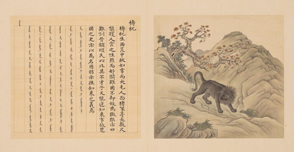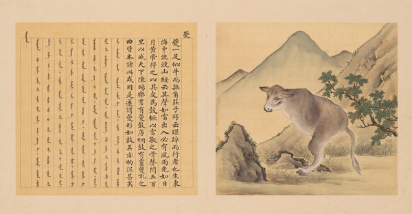 《兽谱图册》由清乾隆时期宫廷画师余省、张为邦合绘。全套共六册,描绘了从瑞兽麒麟到异国奇兽共一百八十种动物形象,除常见的家畜外,还描绘了狮子、老虎等猛兽,以及《山海经》中记载的诸多奇异怪兽。并对每种动物的名称、习性等作了详细说明。