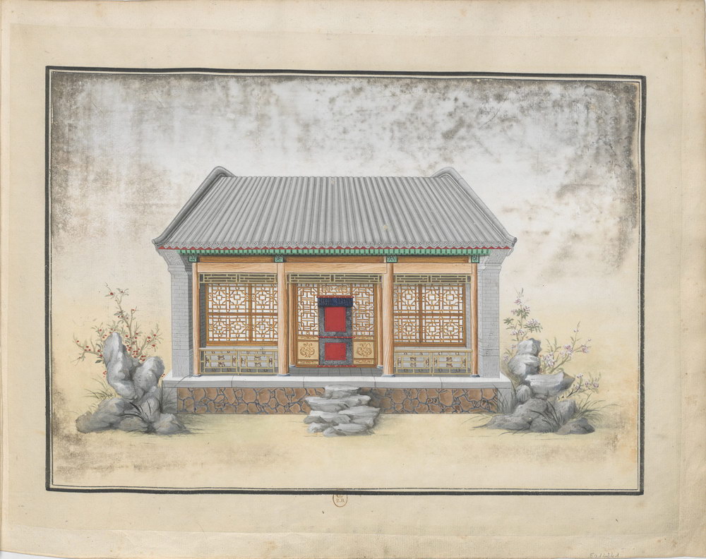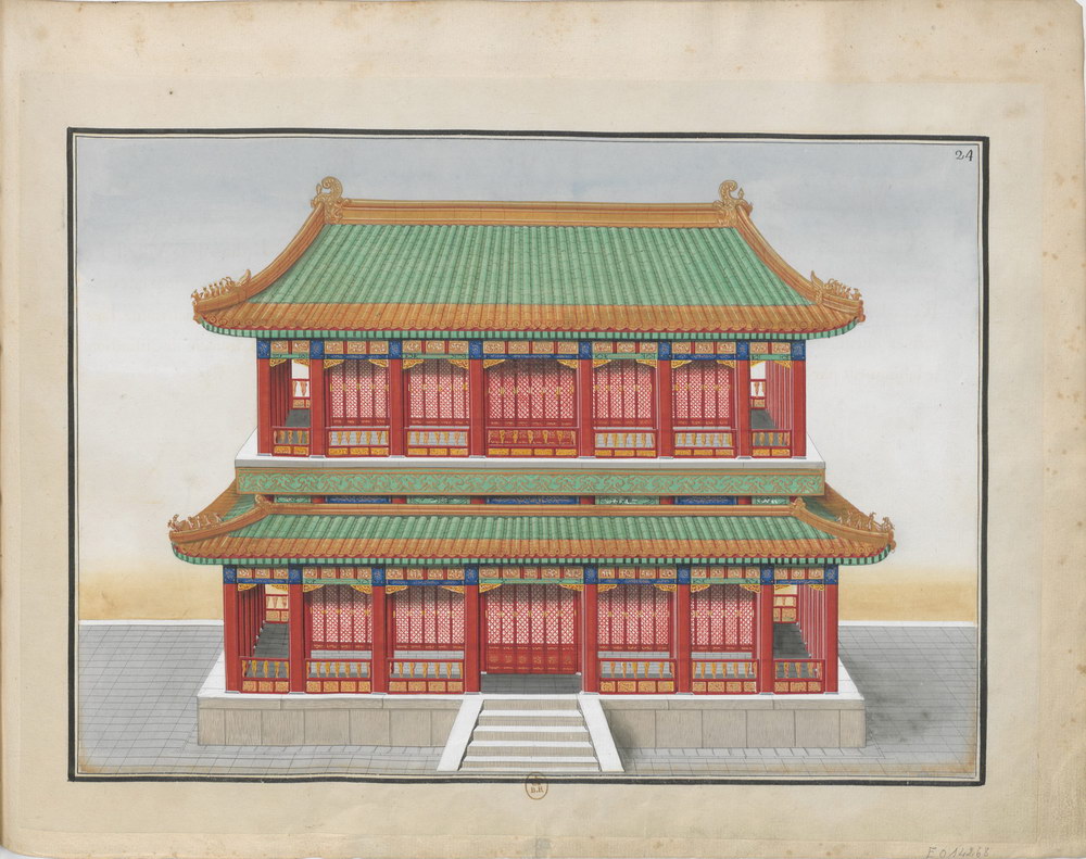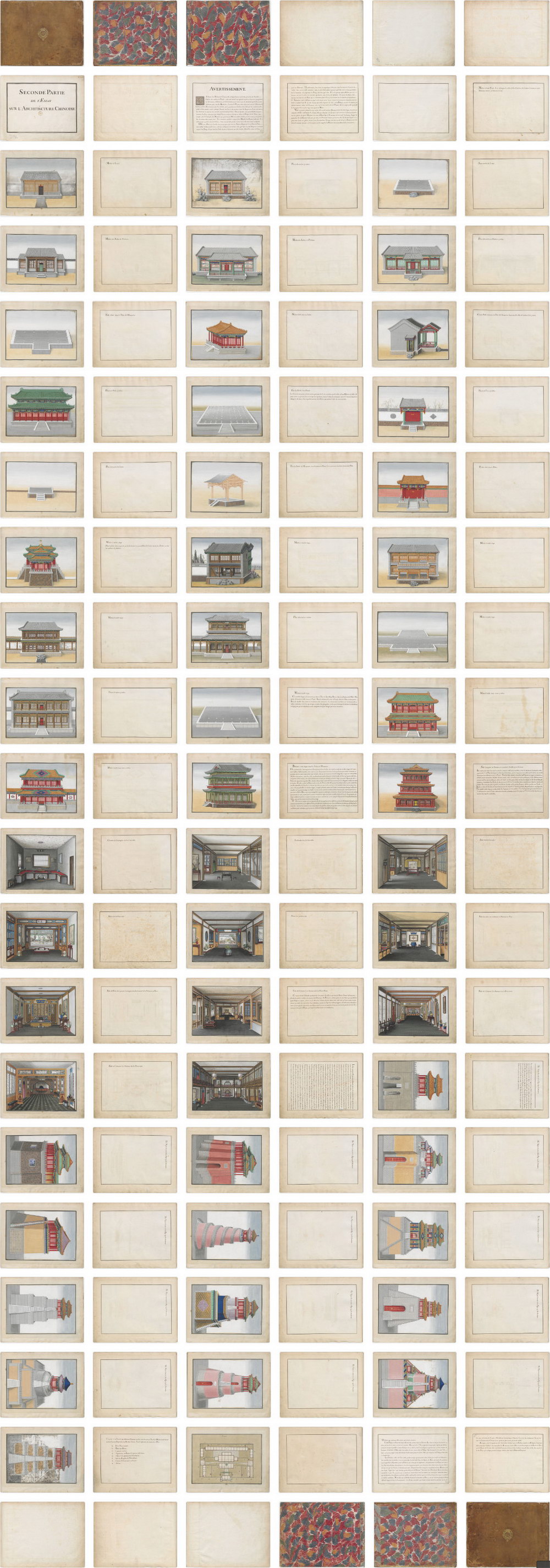 法文和中文注解本《Essai sur l’architecture chinoise》(中国建筑彩绘笔记)是一本描绘介绍中国建筑彩绘的笔记画谱。第二册主要是大型整体建筑结构和内部摆设等。