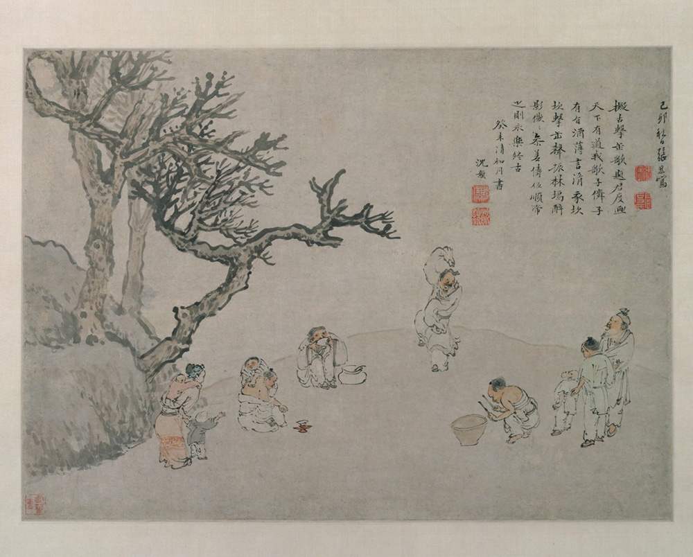 图绘村边平坡,老树几株,一人击缶,一人起舞,男女老少多人围观。构图疏朗,用笔率意简放。树石仅用阔笔草草写出,人物线条迅疾多变,突出了坐、立、蹲、行等不同动态,笔简意赅,神完气足。此图将乡间民众娱乐生活的瞬间刻画得活灵活现,淋漓尽致。