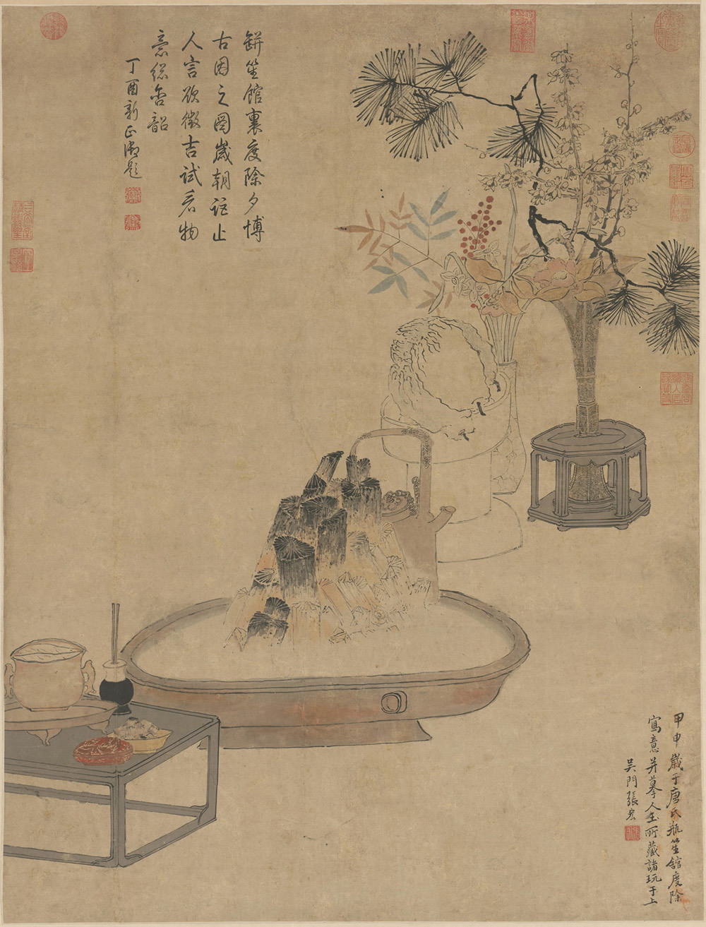 此图是张宏六十八岁在友人家除旧迎新之际所作。他以对角线式的构图,绘制了水仙、柏枝、天竹以及友人所藏的哥窑瓷器、青铜花觚等器皿。图中以与“福”谐音的佛手和燃烧的炭盆最引人注目,表明了作者企盼在明末清初兵荒马乱的政权交替之际,能够与福同在,并且红红火火地享受幸福之年。全图运笔工致,色彩丰富,其绚丽的晕染与新年喜庆的主题相契合。