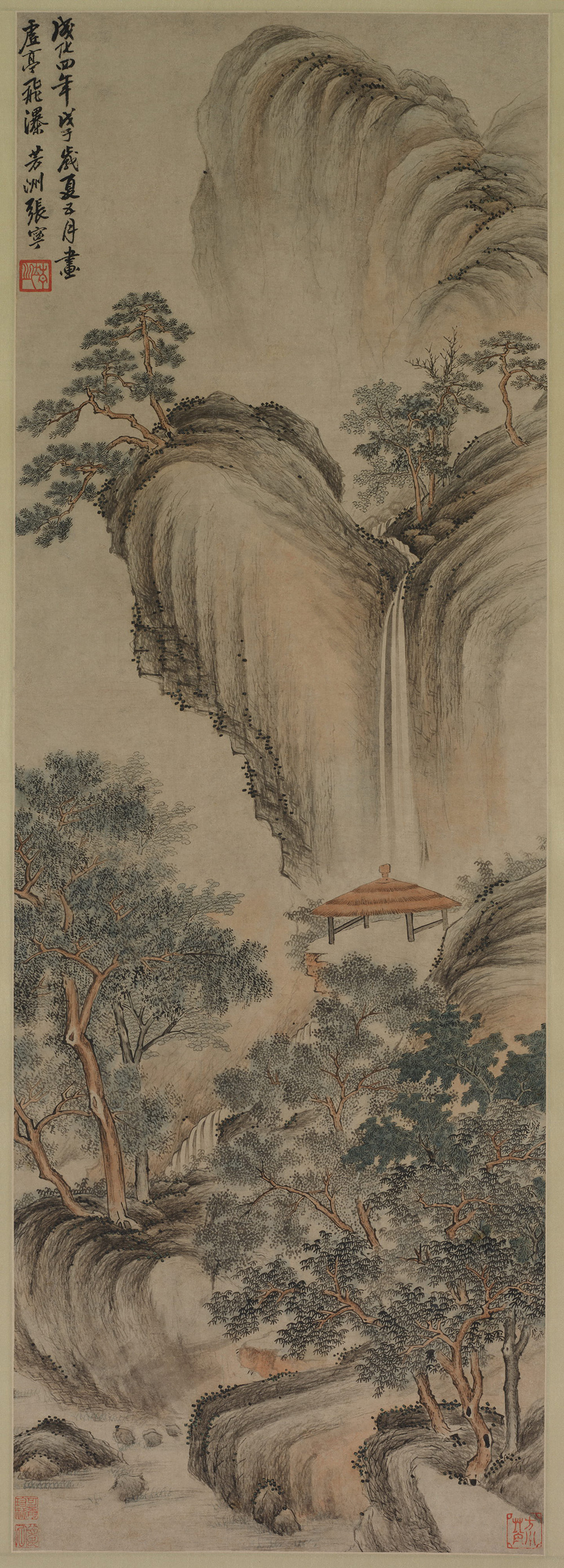 款识:成化四年(1468年)戊子岁夏五月画虚亭飞瀑 芳洲张宁