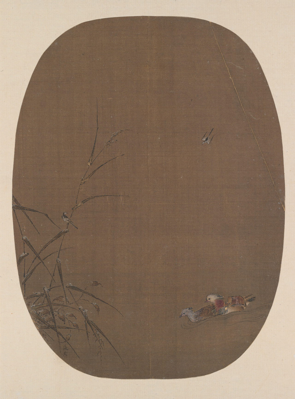 此图选取水景局部:一丛芦苇蓼草探入画面,枝叶稀疏,叶留残雪。一对鸳鸯破水而行,游向苇丛。一只鹡鸰轻栖于苇杆,与俯冲而下的另一只遥相呼应。画面中、上部大片空白,使人联想到广阔水域的浩渺烟波,在构图上颇得小景见大之妙。本幅款识:“张茂”。