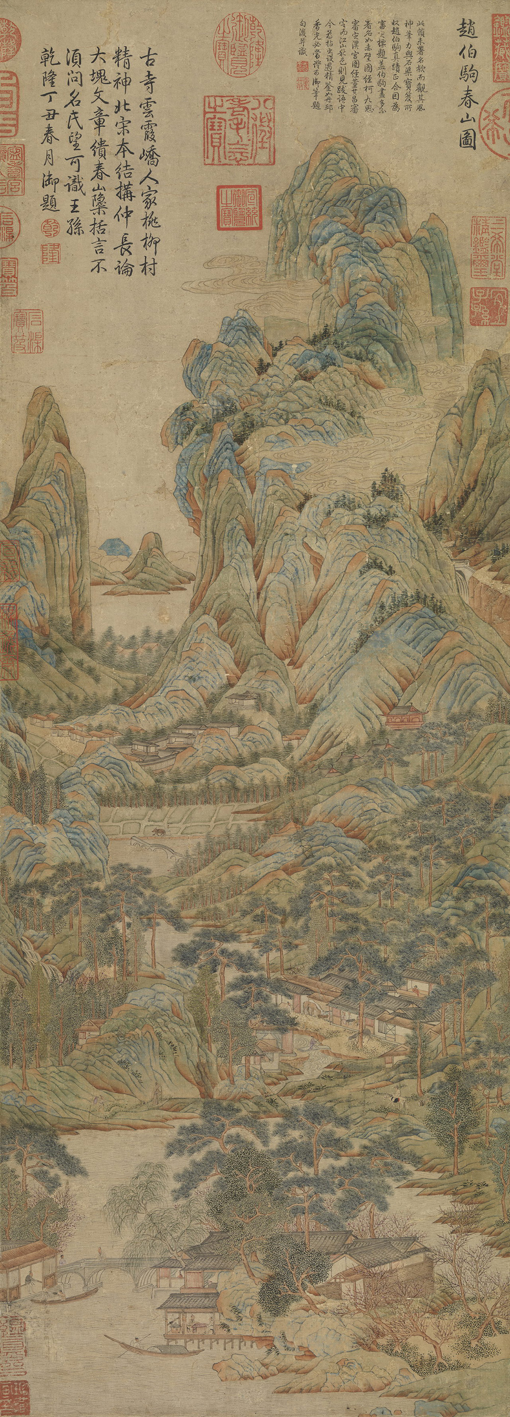此作无名款,以细笔描绘沿溪风光,空间绵延,物象丰富,甚得乾隆皇帝喜爱。根据乾隆二十二年的题跋,乾隆皇帝 “观其风神笔力”,故称为赵伯驹之作。本幅画山水晴云,游骑寻春,村家桃柳,水亭茶话。通幅以青绿为主调,生动地表现出春日触目皆绿的景致。