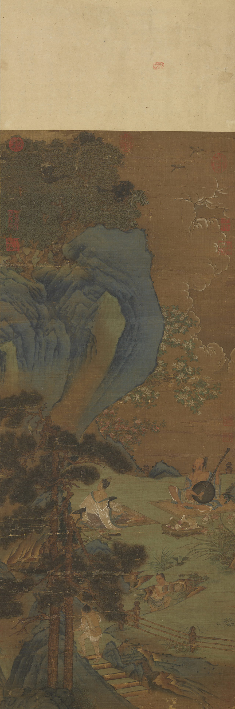 本幅写松石间瓜果堆盘,一人袒衣席地拨阮咸,一人背坐握羽扇倾听,横琴于膝,二童子捧壶执卷。穿著透明薄纱踞席而坐,专注聆听黄鹂的鸣唱。这幅画使用矿物性颜料石青、石绿描绘瑰丽的山石,因此被归在以青绿山水闻名的宋代贵族画家赵伯驹名下。实际上可能为元代以后的画作。