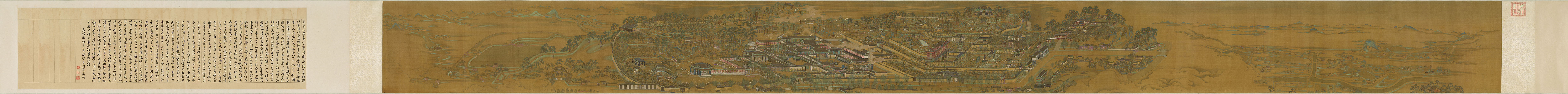 应为清人临摹绘本。画卷内容描绘的可能是宋代绍兴子城(越子城)贾似道宅邸及其周边的景象。其中殿阁廊亭,栉比鳞次,囿中遍置奇花异卉,松、竹、柳树,夹道列植,一片繁华缛丽。