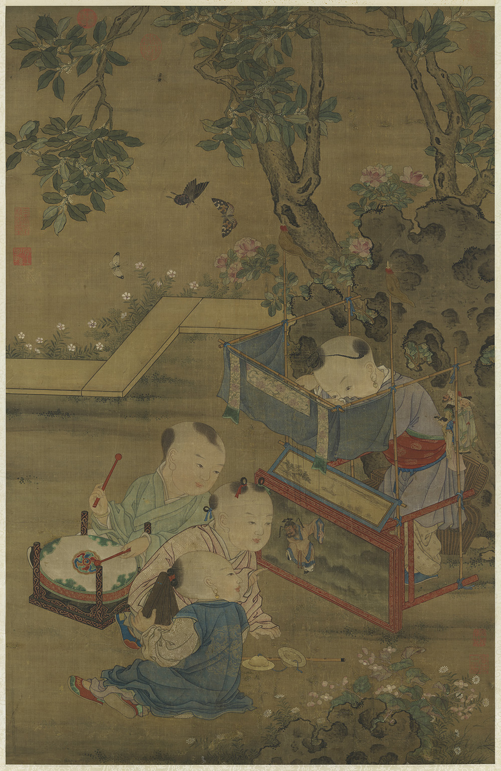 画童子四人,一人于帷幕中操持锺馗傀儡为戏,一人击鼓,一人打板,另一人作指点状。庭院周遭,并装缀花卉蜂蝶诸景。细审画中人物五官、发型、服饰,率皆钩染细腻,神情毕具,饶有苏汉臣一派 “著色鲜润、体度如生” 的意趣。惟配景花树,失之刻镂、少自然,加以湖石上附加的苔点,画法已近乎明人习气。以是,推断此幅原应有所本,当属明代仿宋的佳作。本幅无作者款印。