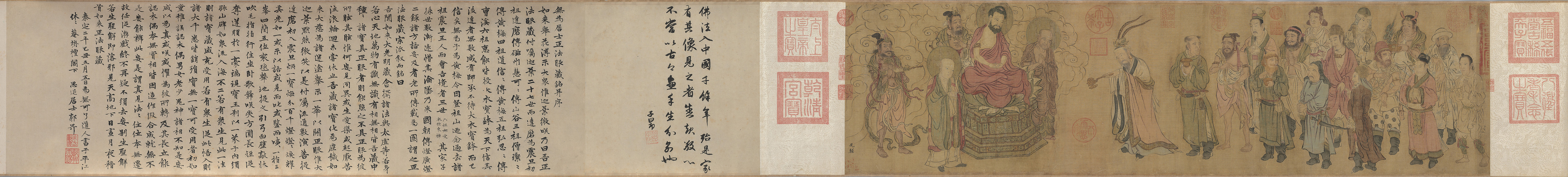 此图画中国周边少数民族酋长、番王朝拜佛祖的形象。佛祖高坐莲台,诸番王作礼拜、贡献之状,服饰皆异域装束。画面气势宏大,人物安排疏密有致,表情各异,生动自然。