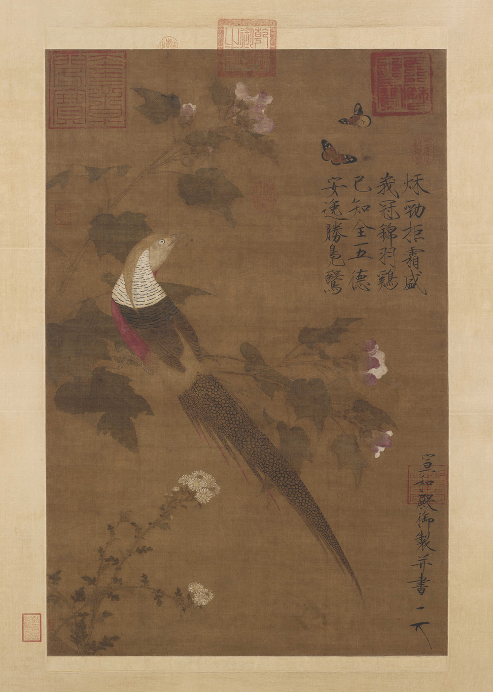 此图是描绘金秋景色的花鸟画作。图中芙蓉盛开,随风轻轻颤动,蝴蝶翩跹,相互追逐嬉戏,引得落在枝上的锦鸡回首凝视,目不转睛。本幅右上宋徽宗赵佶以瘦金体题“秋劲拒霜盛,峨冠锦羽鸡。已知全五德,安逸胜凫鹥”,右下书款“宣和殿御制并书”,草押书“天下一人”。鸡在中国向有“德禽”之称。