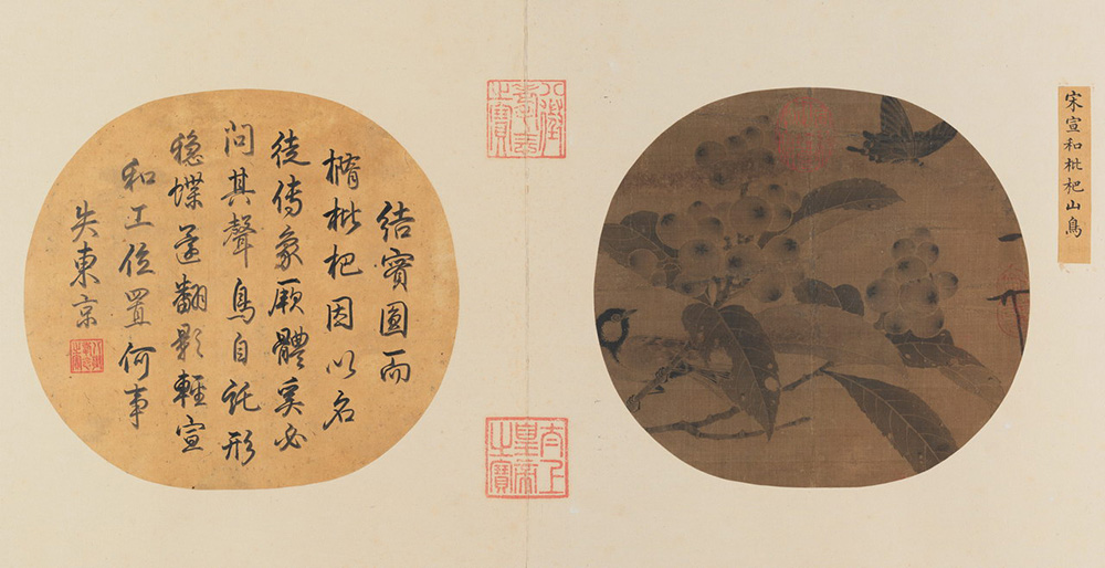 对开有清乾隆御题诗一首:“结实圆而椭,枇杷因以名。徒传象厥体,奚必问其声。鸟自讬形稳,蝶还翻影轻。宣和工位置,何事失东京。”感慨宋徽宗如此精于绘画,工于构图和经营位置,缘何却把国家丢失了?