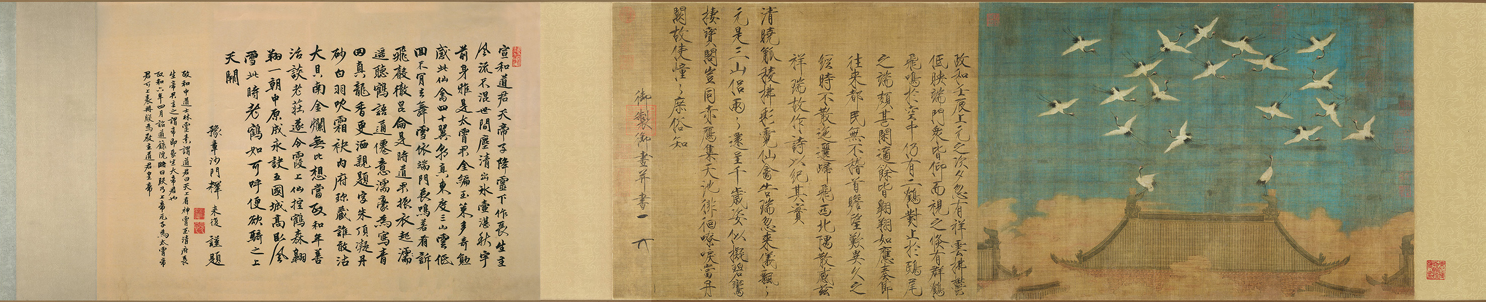 绘彩云缭绕之汴梁宣德门,上空飞鹤盘旋,鸱尾之上,有两鹤驻立,互相呼应。画面仅见宫门脊梁部分,突出群鹤翔集,庄严肃穆中透出神秘吉祥之气氛。画作左侧有赵佶瘦金体题诗,看画赏字,实乃快哉!