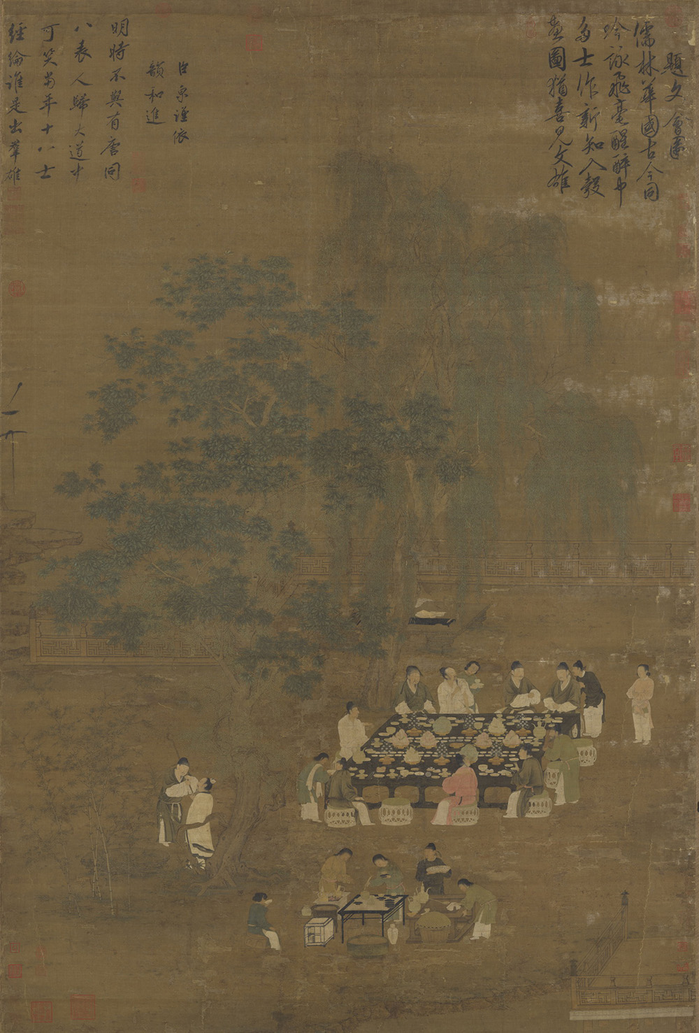 本幅描绘池边大树下,一群文士正据案饮宴。前方有童仆在一小桌上备茶,其中一人手持长柄匙自茶罐舀取茶末,沿用的是唐末以来盛行的「点茶法」。人物皆神情雅俊,衣褶挺劲生动。竹树俱用双钩,笔笔细劲,如钢针鑴铁,必尽全力。通幅笔迹繁细,千丝万缕,而无一懈笔,盖极精妙之能事矣。此画庭台器具描绘得极为华美,有别于五代时文会图简单的背景,北宋的文会图系置于完备的花园场景之中,由此也反映出北宋园林的发达。此图右上虽有徽宗题诗,左中有他的画押,左上另有蔡京题诗,但俱属可疑,应是画院中名手之作。