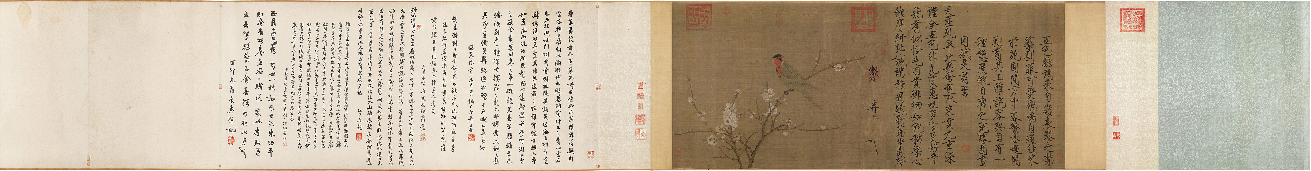 此图为横卷,画中一只鹦鹉立于一斜枝上,鹦鹉得意自适,似与人语,俏姿可掬。正是春光明媚之时,杏枝抽条,白花朵朵,欣欣日上。此图是一幅写实性的小品,可以看出徽宗“妙体众形”的深厚功力。