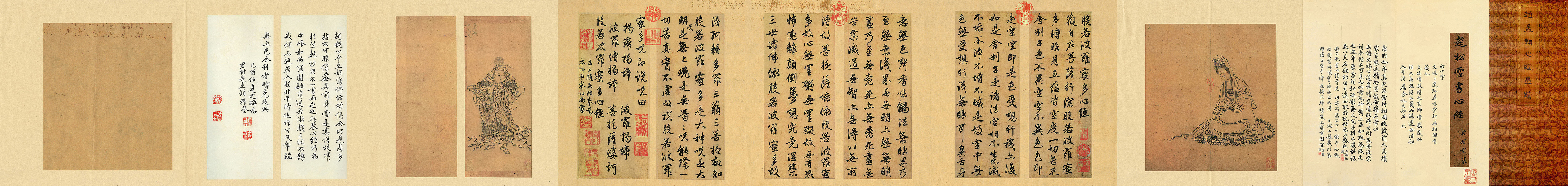 赵孟頫《心经》册页装,3开。第1开前1开,是白描观音大士像。第3开后第1开,是白描韦陀像,后面第2-3开是明王稚登、清张英、张照、励宗万等人跋和原梁清标题签。此册原为清张若蔼旧藏,有“炼雪鉴定”、“晴岚居士”等印。乾隆时入清宫,有乾隆、嘉庆、宣统内府藏印。《心经》原为手卷,入清宫后改为册页,并加装檀香木雕花夹板。《心经》前后的《观音像》、《韦陀像》是清人所绘。著录于《秘殿珠林续编》。