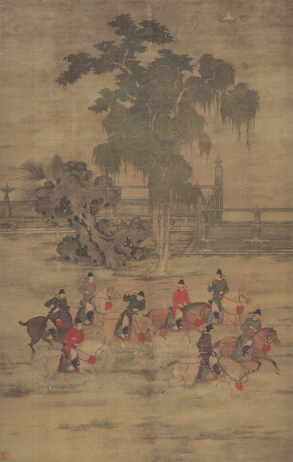 本幅画八名贵族男士,骑骏马出游,园中草木呈新绿之色,马匹踏著轻步,表现出春游的愉悦气氛。本画人马、树石笔调之精致细腻,超过唐与五代之作,似北宋人的风貌,但它又保存了部分唐画之意,如主题放置于画面中央,前、中、远景采取层层而上的方式,来代表深度空间。此外,背景庭园中之巨型太湖石也是出现在古画中极早之例。
